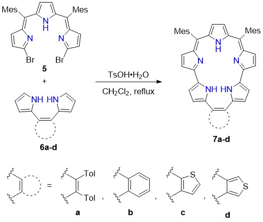 扩环卟啉因其灵活多变的结构,丰富的配位化学性质及独特的反应活性而备受关注。其中Sapphyrin作为世界上合成的首例扩环卟啉,其研究历史悠久,目前在离子识别,人工模拟捕光天线模型及光动力治疗等领域表现出良好的应用前景。最近,宋建新教授团队饶玉滔研究小组设计了系列Sapphyrin的异构体五元扩环卟啉(2.0.1.1.0) 7a-d(图1),研究人员发现不同桥连基团对五元扩环卟啉(2.0.1.1.0) 7a-d的芳香性有重大影响。
