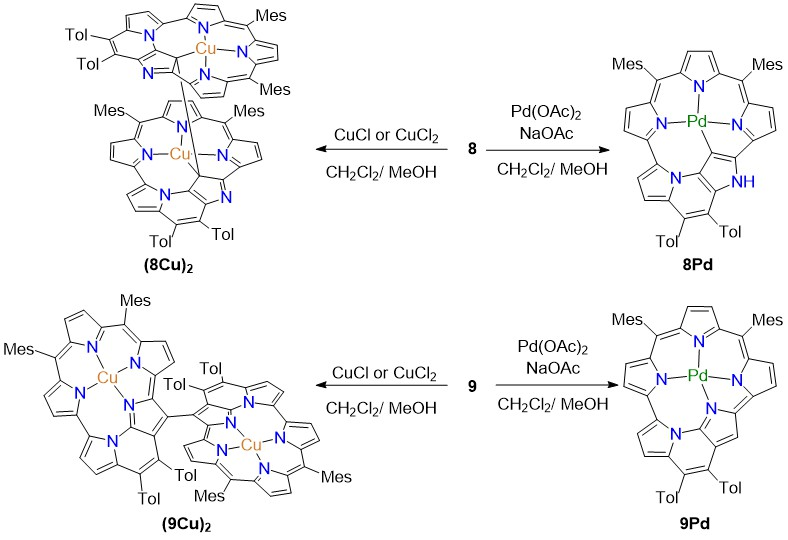 随后研究人员探究了化合物8和9的配位化学性质。8和9与Pd(OAc)2进行配位,可高产率获得相应PdII配合物8Pd和9Pd(图3)。当研究人员采用CuCl2或CuCl与化合物8和9进行金属配位的同时还发生了二聚体化反应,分别生成了面对面CuII配合物二聚体(8Cu)2和线形CuII配合物二聚体(9Cu)2。