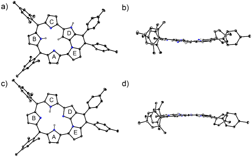 随后,研究人员对7a进行氧化获得氮稠合五元扩环卟啉8和吡咯重排的氮稠合五元扩环卟啉9。通过X射线单晶衍射发现(图2),二者的吡咯E都与相邻的吡咯D发生了氮稠合反应,不同的是8的吡咯D发生了翻转而9的吡咯D发生了重排。从图2可以看出化合物8和9的共面性良好,核磁共振氢谱和理论计算表明,化合物8和9均为22p电子Hückel芳香性。