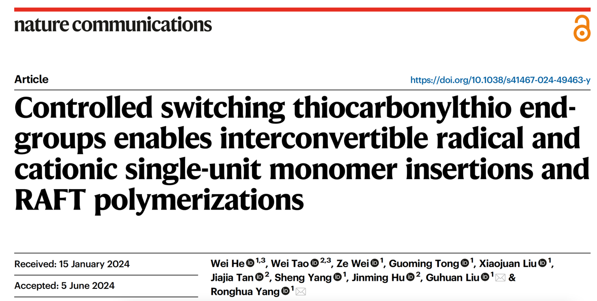 Wei He, Wei Tao, Ze Wei, Guoming Tong,Xiaojuan Liu,Jiajia Tan,Sheng Yang, Jinming Hu, Guhuan Liu, and Ronghua Yang“Controlled switching thiocarbonylthio end-groups enables interconvertible radical and cationic single-unit monomer insertions and RAFT polymerizations”Nat. Commun.2024, 15,5071