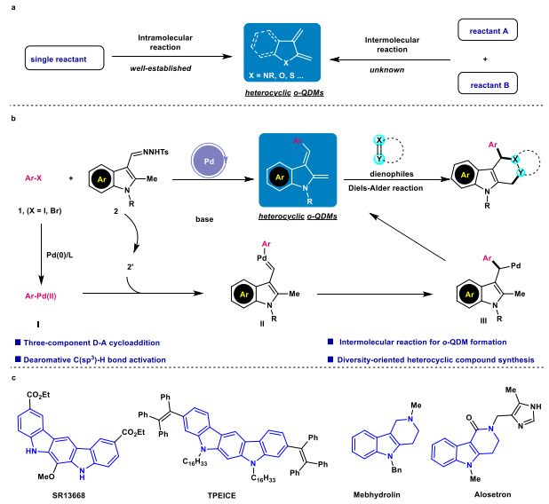 邻二亚甲基醌(o-QDM)是一种高活性瞬态物种,可以作为双烯体参与Diels-Alder (D-A)反应。开发实用且有效的策略生成邻二亚甲基醌物种具有重要意义。目前,已知文献报道的催化反应策略都是由单一的反应物原位生成o-QDM中间体。o-QDM结构的多样性很大程度上取决于相应单一反应物来源的难易程度。利用两个简单易得反应物之间的催化偶联反应,原位生成o-QDM的方法还从未见文献报道。黄学良课题组致力于研究桥联C-H键活化反应策略(Bridging C-H Activation)(Angew. Chem. Int. Ed. 2018, 57, 319; Nat. Commun. 2020, 11, 461; Angew. Chem. Int. Ed. 2020, 59, 18261; ACS Catal. 2021, 11, 1570; Cell Rep. Phys. Sci. 2022, 3, 100776; Angew. Chem. Int. Ed. 2023, 62, e202300703)。本文开发了一种卡宾桥联C(sp3)-H活化反应策略,通过芳基卤化物与吲哚衍生的磺酰腙反应,去芳构化可生成吲哚杂环型o-QDM中间体。该中间体与磺酰亚胺和3-硝基吲哚发生D-A反应,可以快速构建具有吲哚啉及咔唑结构的杂环化合物。该方法有望用于相关活性分子和功能材料分子的合成。山东大学陆刚教授课题组结合DFT计算对反应机理进行了探索。