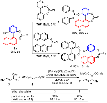 合成应用方面,化合物2a通过一步转化即可获得新型手性亚磷酸酯配体5和6,这类配体在钯催化的烯丙基烷基化反应中显示出很好的催化活性和良好的手性诱导能力(Figure2)。进一步,基于此类桥联轴手性联芳基化合物的新型合成方法学开发及其在新型手性配体的设计、合成与应用方面的研究正在开展。