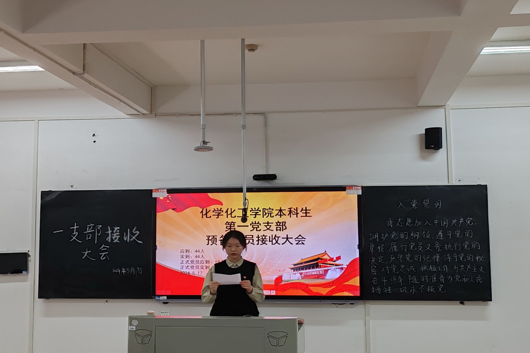 会议伊始,宓英华简述了接收大会流程,朱羿晓等12名同志依次上台从思想、工作、学习等方面进行自我总结,向支部提出申请,党支部委员依次宣读入党介绍人意见以及支部意见,进行现场评议、投票,同意接收朱羿晓等12名同志为中共预备党员。会议最后,宓英华同志带领全体同志宣读入党誓词。