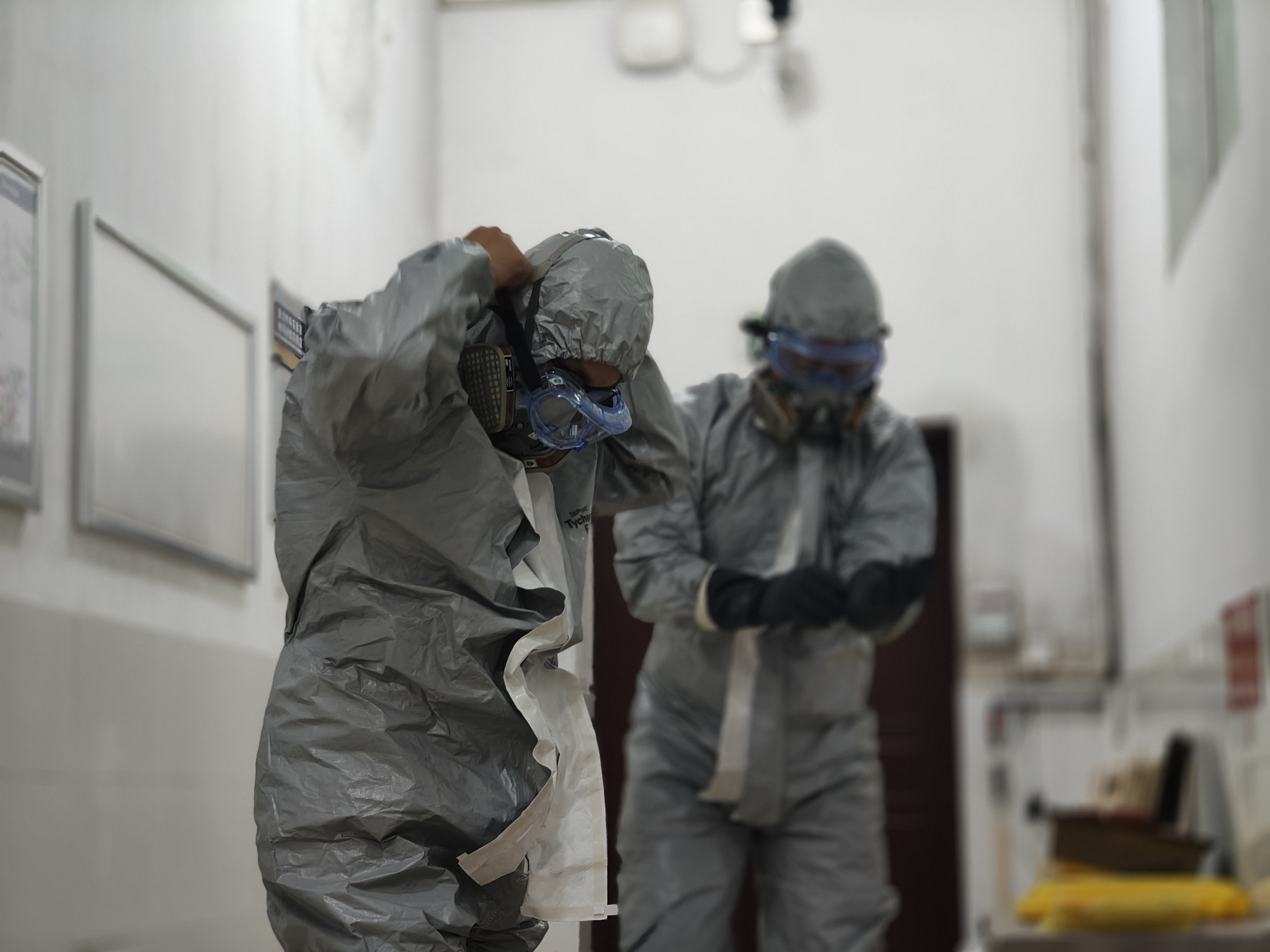 本次演练主要展现了废液倾洒后的紧急处理过程,由废液搬运组、医疗救护组、抢险组、紧急疏散组及善后组构成,演练现场呈现了实验室危险化学品与皮肤接触、眼睛接触、吸入和泄露四个方面造成伤害的应急处置。