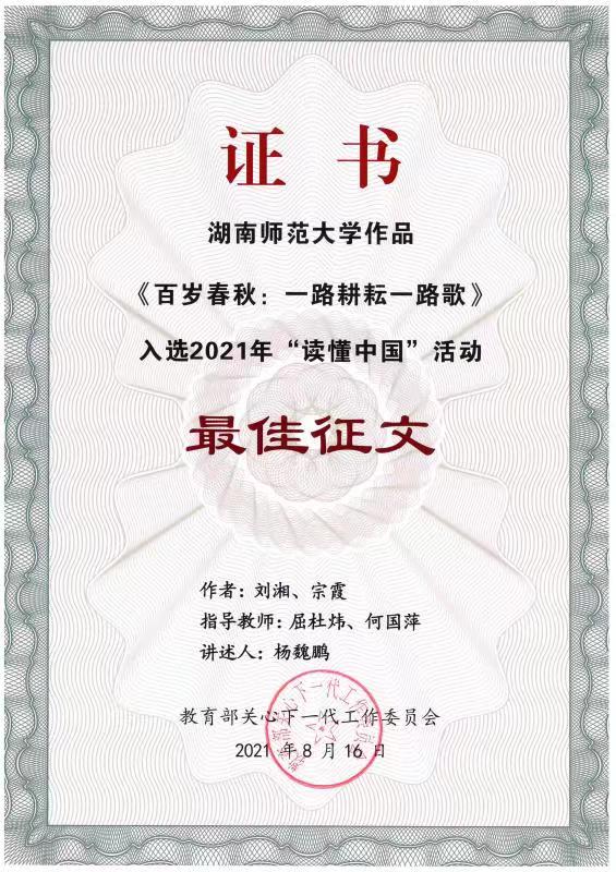 在校关工委何国萍老师的关心下,化工院关工委易理国老师、罗艳老师、屈杜炜老师指导下,化工院共收到100余篇征文。学生刘湘、宗霞的征文作品《百岁春秋:一路耕耘一路歌》获征文一等奖,同时获评教育部关工委最佳征文奖,并且我院学院杨魏鹏作为文章讲述人,参加中国教育电视台读懂中国活动录制,为伟德国际victor1946在此次活动中获奖做出贡献,展现了化工学子的精神面貌和化工院的风采。
