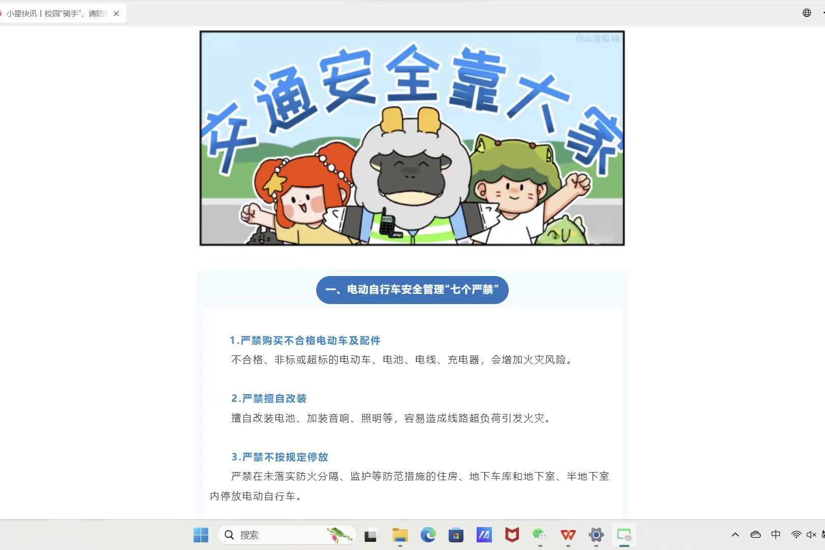 王彻向同学们介绍了“电动自行车安全管理‘七个严禁’”、“驾驶员及搭载人员相关规定”、“骑行装备与着装”、“骑行规则与习惯”和“违纪处分”等五个方面的事项。为了平时的出行方便,班级部分同学购买了电动自行车,王彻提醒同学们要选择安全性能达标的电动车及配件,充电时要在要在规定的安全区域内进行,骑行时应佩戴安全头盔,按交通规则行驶,在路上要注意避让机动车和行人。另外,王彻还通过实际案例的介绍,让同学们知道事故发生的原因,了解碰到类似的情形应该怎么正确处理。