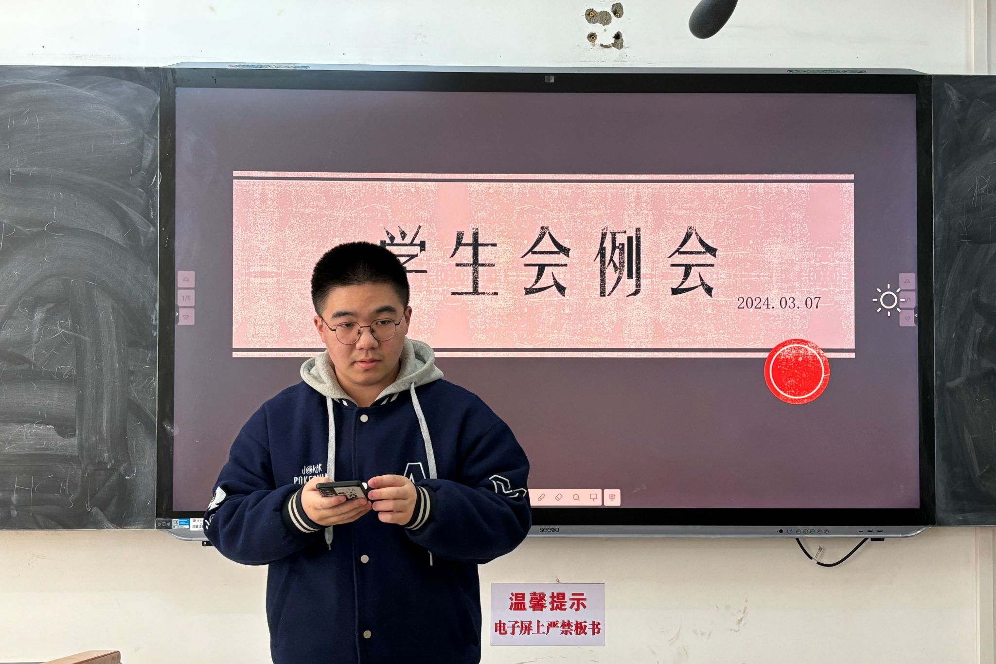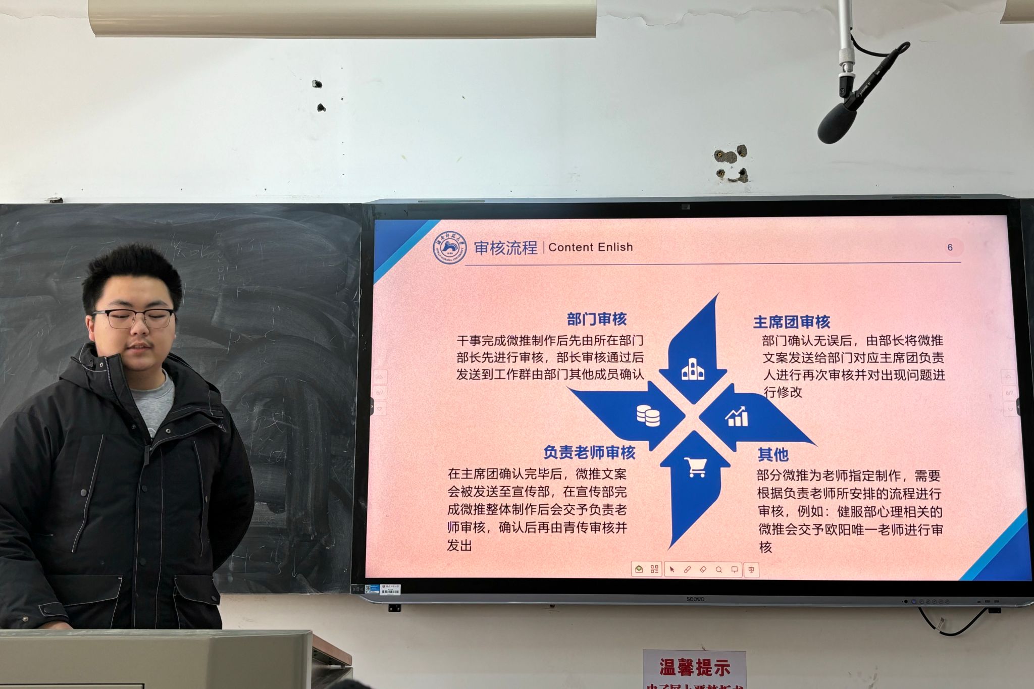 在各部门开展工作汇报之前,健服部干事韩毅上台讲解第一次春季办公室技能培训。韩毅通过PPT汇报的形式,为各成员介绍了关于微推的制作过程、微推文案的要求以及微推的审核流程,详细地向参会人员讲述了相关方面的技能。