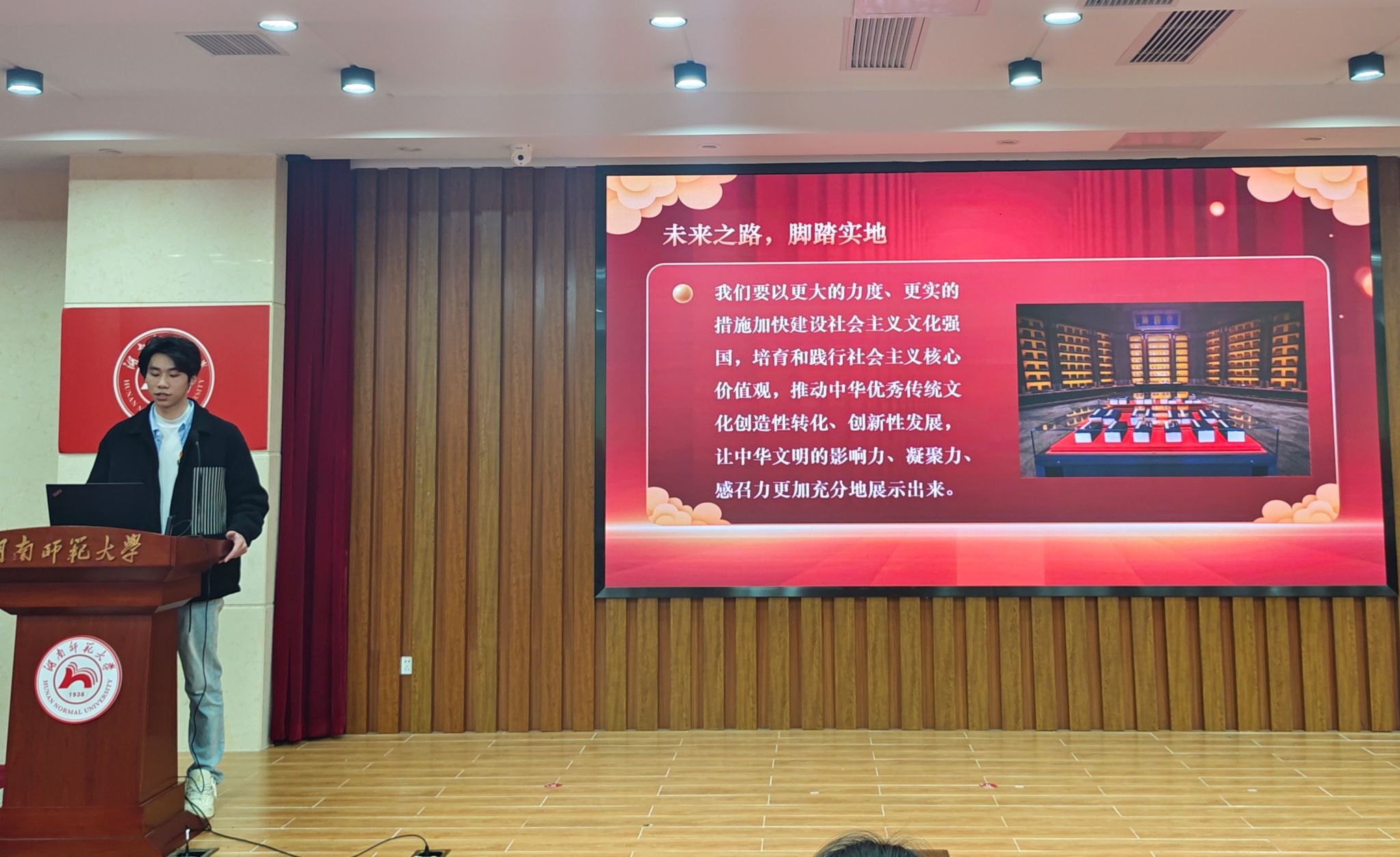 欧阳宇翔上台讲解习近平强军、经济和法治思想。欧阳宇翔认为学生会成员应当结合专业知识和实践经验,对两会中的政策议题进行深入分析,紧跟国家政策的步伐,为国家的发展贡献自己的力量。