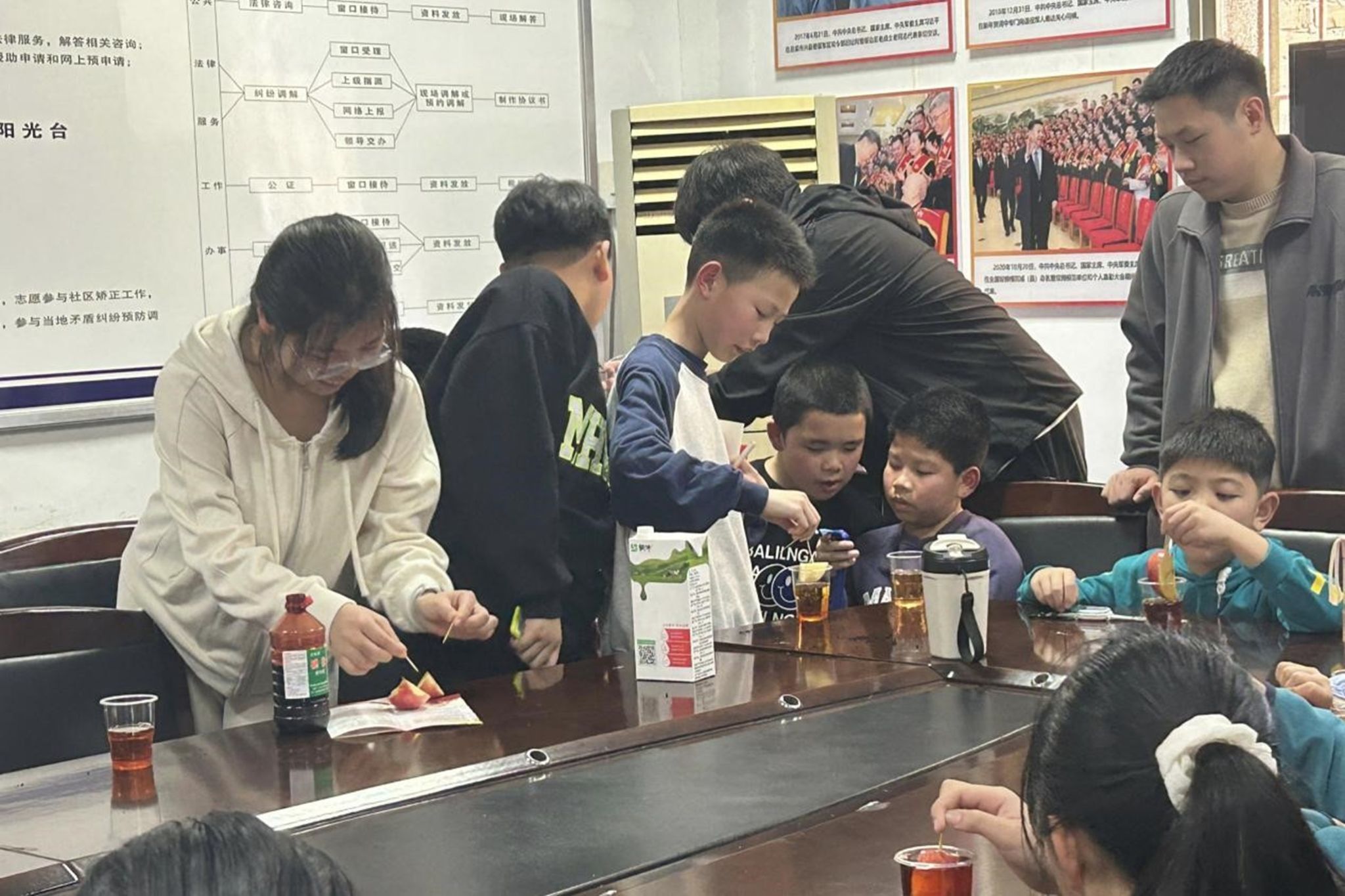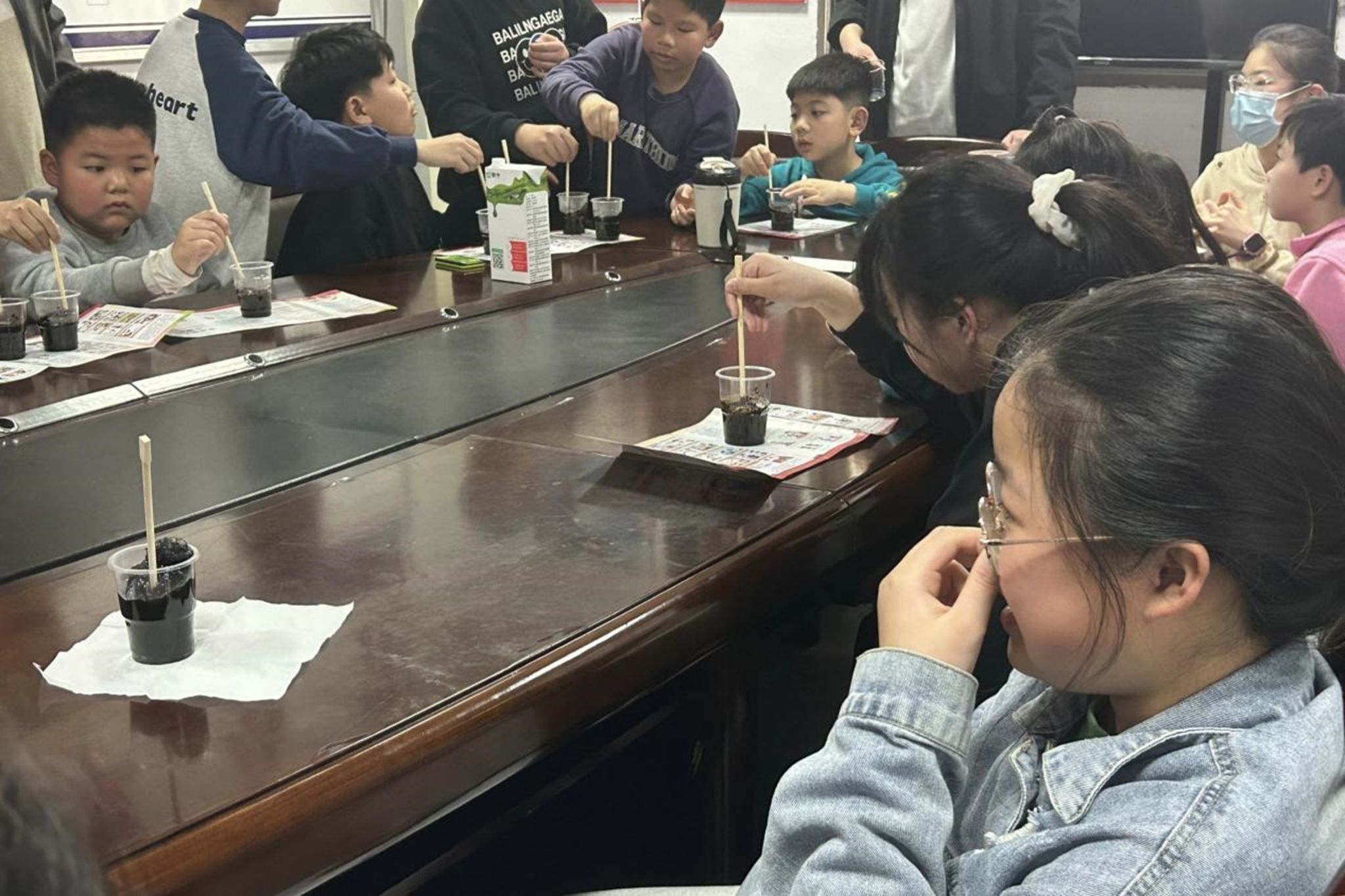 此次活动由理事肖艳准备实验材料和安排活动事项,并在QQ群及空间说说发送活动预告,确保会员知道此次活动,理事会其他成员协助活动正常进行。参与活动的每名会员协助一位小朋友完成实验,确保实验的安全性和准确性。牛奶变煤炭实验中,牛奶与高锰酸钾反应,高锰酸钾将牛奶中的蛋白质氧化,形成如煤炭般的沉淀;碘伏变变变实验中,将苹果放入碘伏中,苹果中的维生素C能使碘伏褪色。