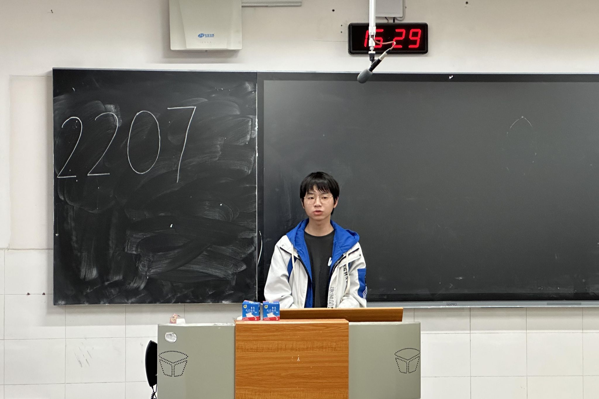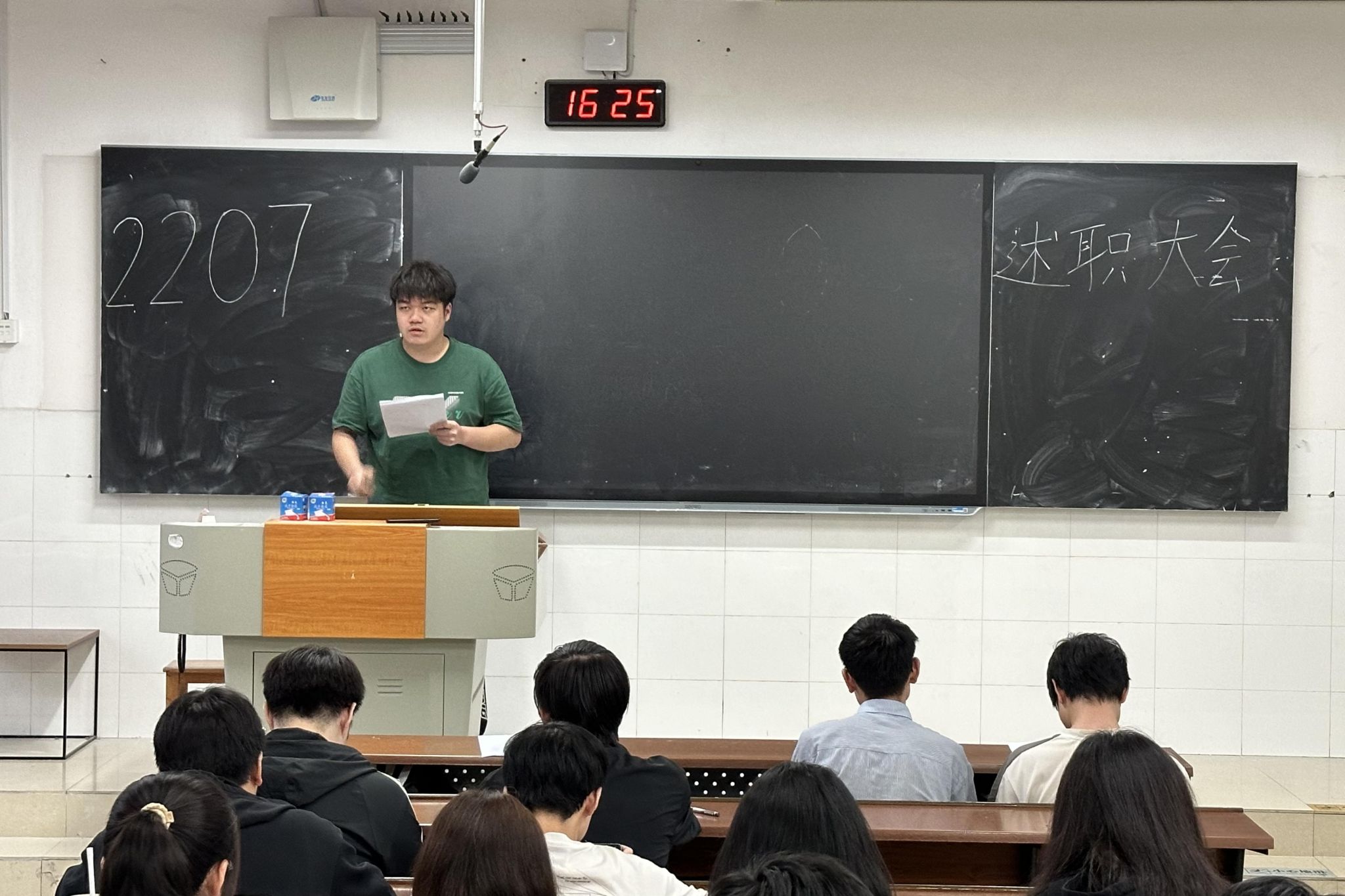 此次会议中参与述职的有班长王康耀、团支书张喆政、青年志愿者委员郭林龄、组织委员龙力游、宣传委员丁玮祺五位班委。会议开始时,王康耀主持会议,强调此次会议的重要性并讲解民主投票规则。班委按照顺序依次从德、能、勤、绩、学五个方面述职,讲述任职以来的成就及为班级作出的贡献,并对工作中的不足之处进行了反思。班级同学对五位班委各方面打分,由王康耀整合并统计平均值。