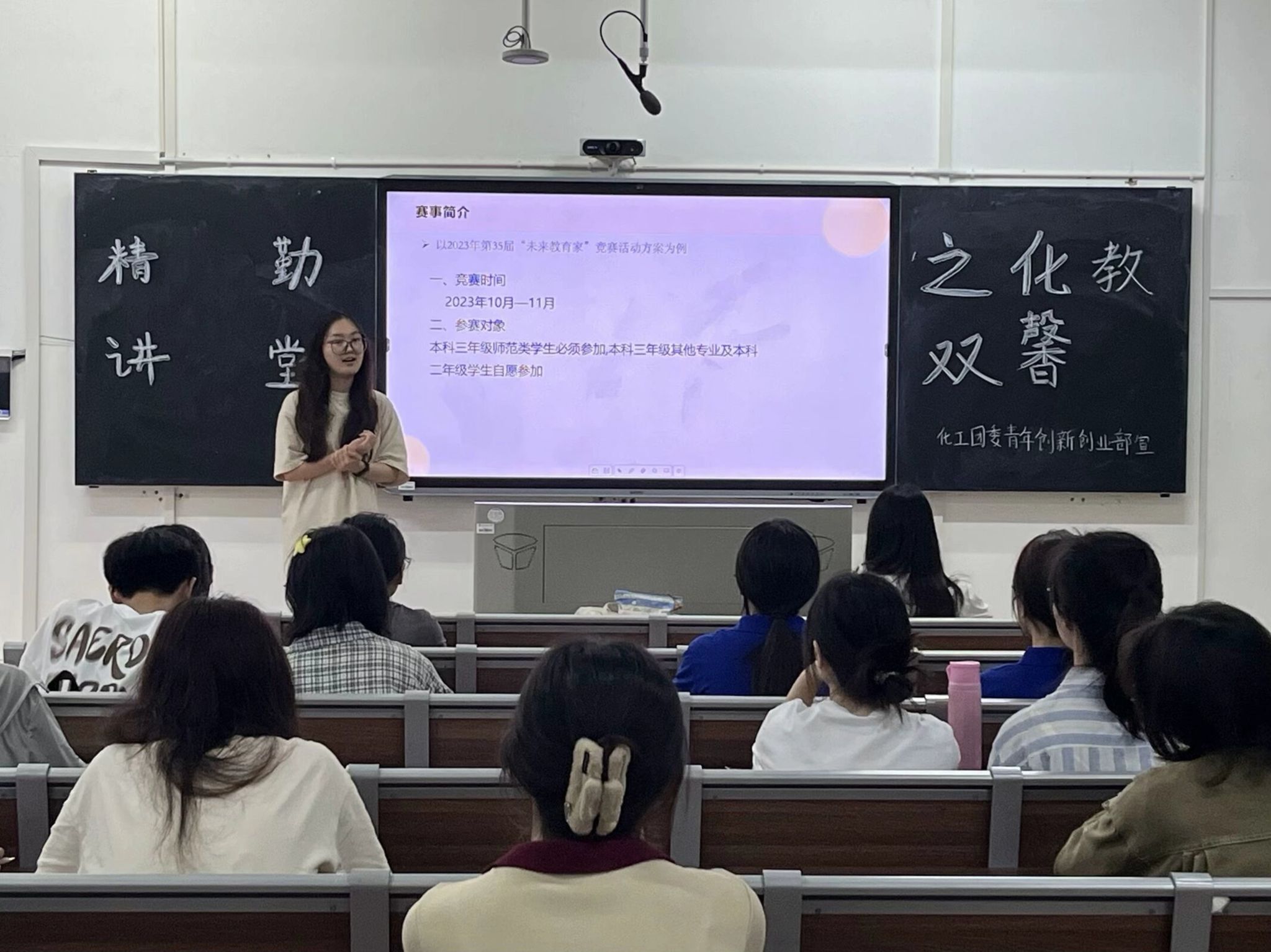 讲堂开始,主讲人结合自身经历,进行了关于化工实验大赛竞赛的经验分享,分别从比赛流程、比赛内容、比赛形式等不同方面进行介绍,并鼓励大家踊跃报名、积极参加,认真准备比赛,积累经验。同时,主讲人还详细介绍了未来教育家竞赛的开展时间、意义以及比赛流程。主讲人讲述,整场比赛分为学院初赛和学校复赛,而院赛中又有初赛和复赛,分享自己的参赛过程,建议同学们多了解,注意细节,激励同学们尤其是对教育感兴趣的同学参加比赛,从中学习平常学不到的东西,获得更多教学经验,更好认识自我。