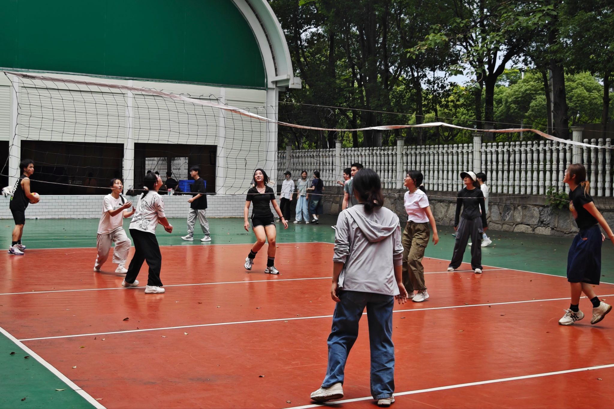 在训练过程中,女排队员注重发球环节中力度与角度的控制,确保高质量发出每一颗球。同时,在接球时,她们也格外注意姿势和时机的把握,力求做到不争球、不抢球,保持队伍的整体节奏。男排队员则侧重于团队配合和得分手段的强化。他们两两配合练习扣球,寻找最佳的进攻方式。在扣球练习中,他们不仅注重力量与速度的结合,还注重与队友之间的默契配合。队员们通过反复练习和沟通,不断优化战术执行,提升整体战斗力。