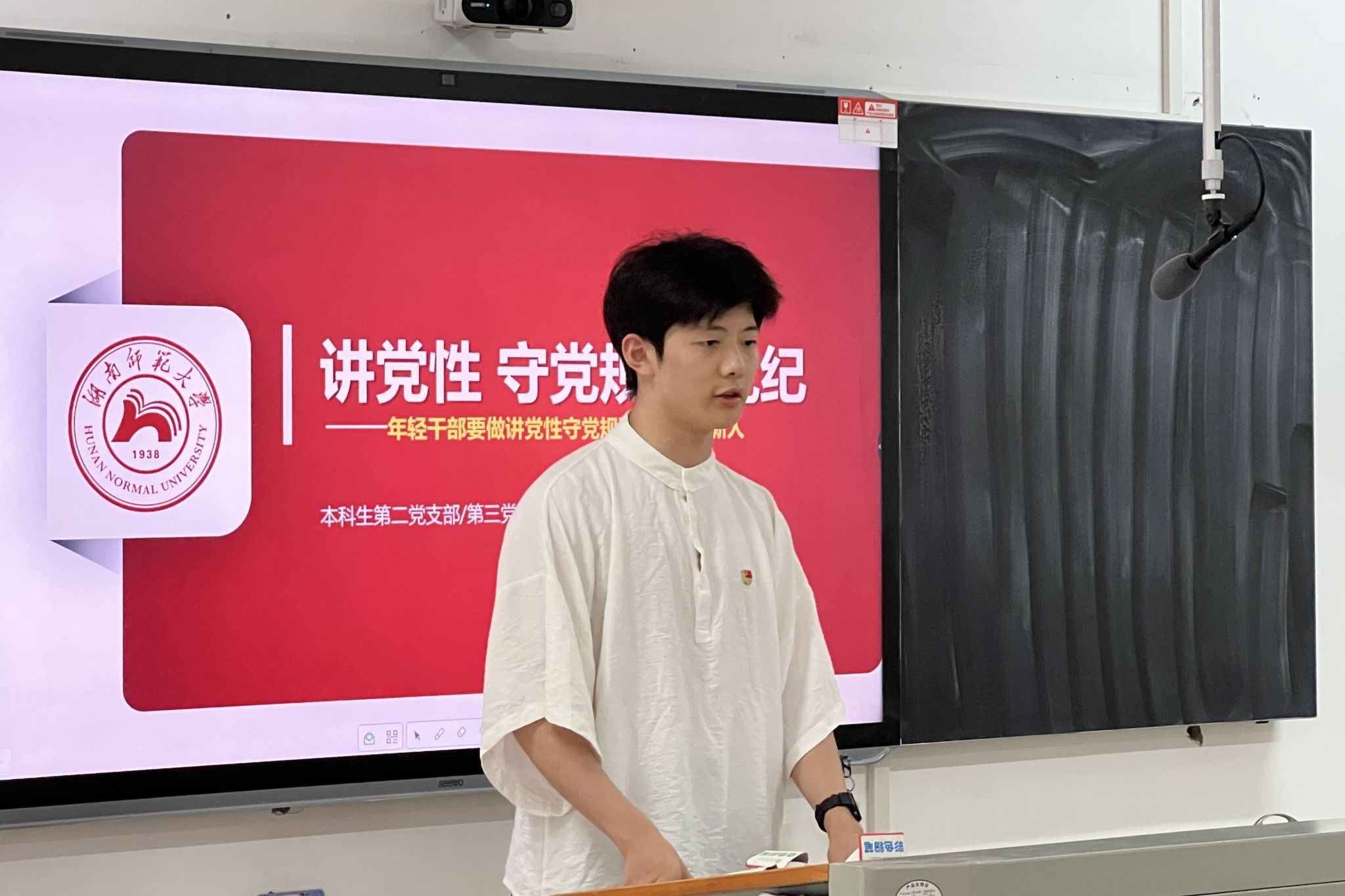 活动以”为什么要讲党性守党规严党纪“为切入点,深化两支部各党员同志对党性党规党纪的认识,借此强调“三大纪律,八项注意”的内容。本科生第三党支部学生书记杨舟平作为代表上台发言,分享自己的学习感悟。