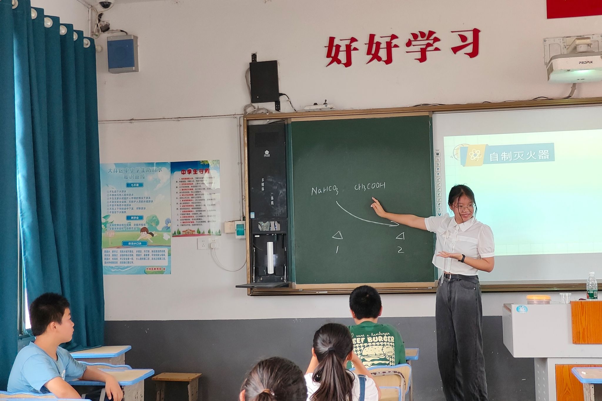 特色课程伊始,化学老师潘晗悦通过消防知识的提问引入课程主题——自制灭火器。潘晗悦向同学们讲解了自制灭火器的灭火原理,并通过了一段简短的视频向同学们介绍了灭火器的种类,着重介绍了今天要进行讲解的二氧化碳灭火器。潘晗悦和同学们对实验内容进行了简单交流,让同学们通过观察液体和粉末的颜色和形状辨别物质的种类,随后在助教老师杨光的协助下为同学们进行了二氧化碳灭火器实验原理的演示实验,收获了同学们的掌声,激发了同学们对化学实验的兴趣。潘晗悦也向同学们介绍了如何正确地使用灭火器,以及使用灭火器的注意事项,确保同学们在生活中遇见险情时也能熟练地使用灭火器,以保护自身生命财产安全。