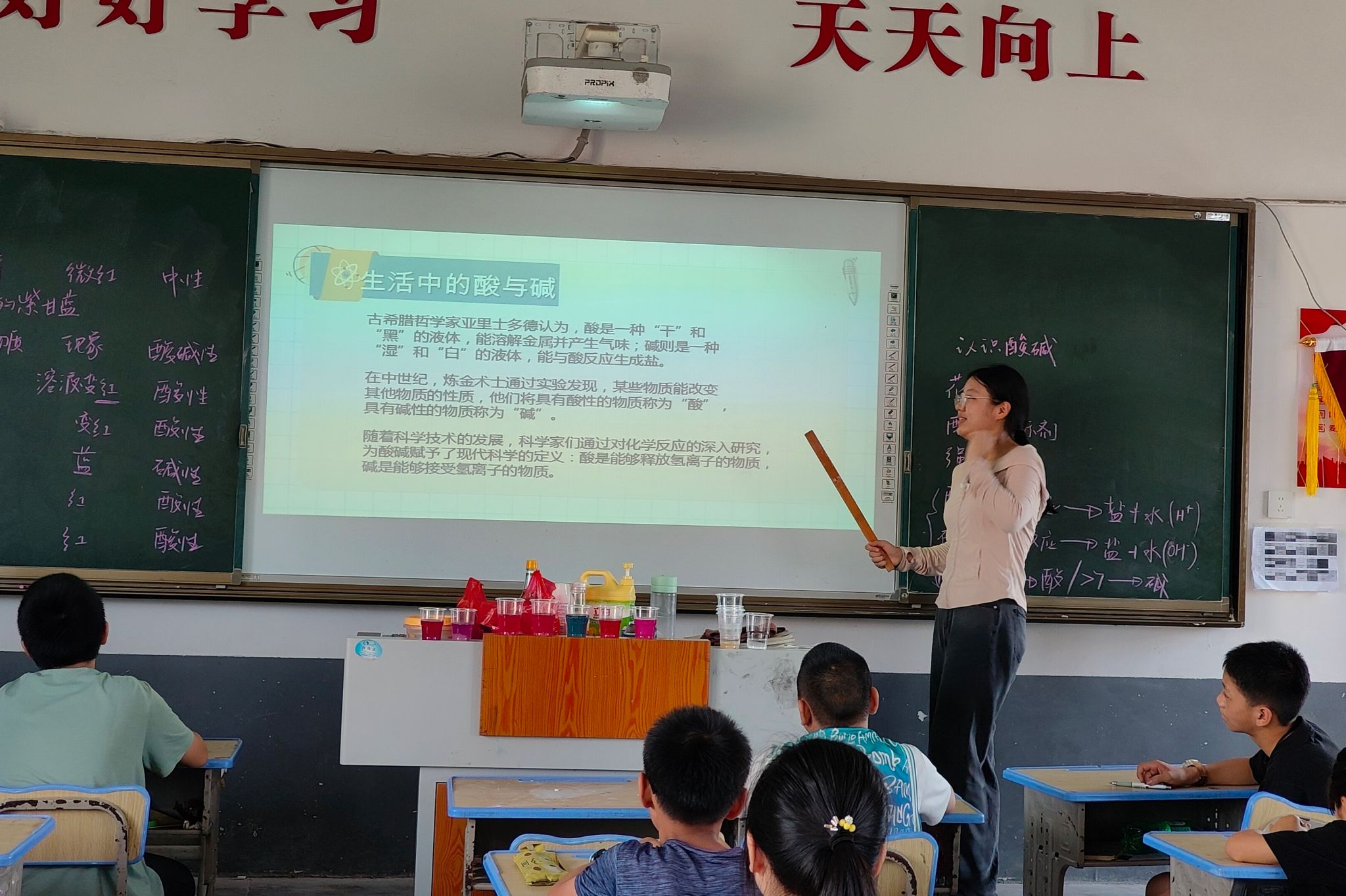 特色课程伊始,化学老师潘晗悦通过蝶豆花茶在碱性条件下变色的实验现象引入实验主题——认识酸碱指示剂。课程分为教师示范实验和学生实验两个部分。潘晗悦结合课程演示文稿和视频向同学们讲解了实验的具体流程,并进行了演示实验。第二部分,助教老师为同学们分发实验材料,带领同学们进行实验操作。每位同学都成功地完成了实验,观察到了变色反应现象。