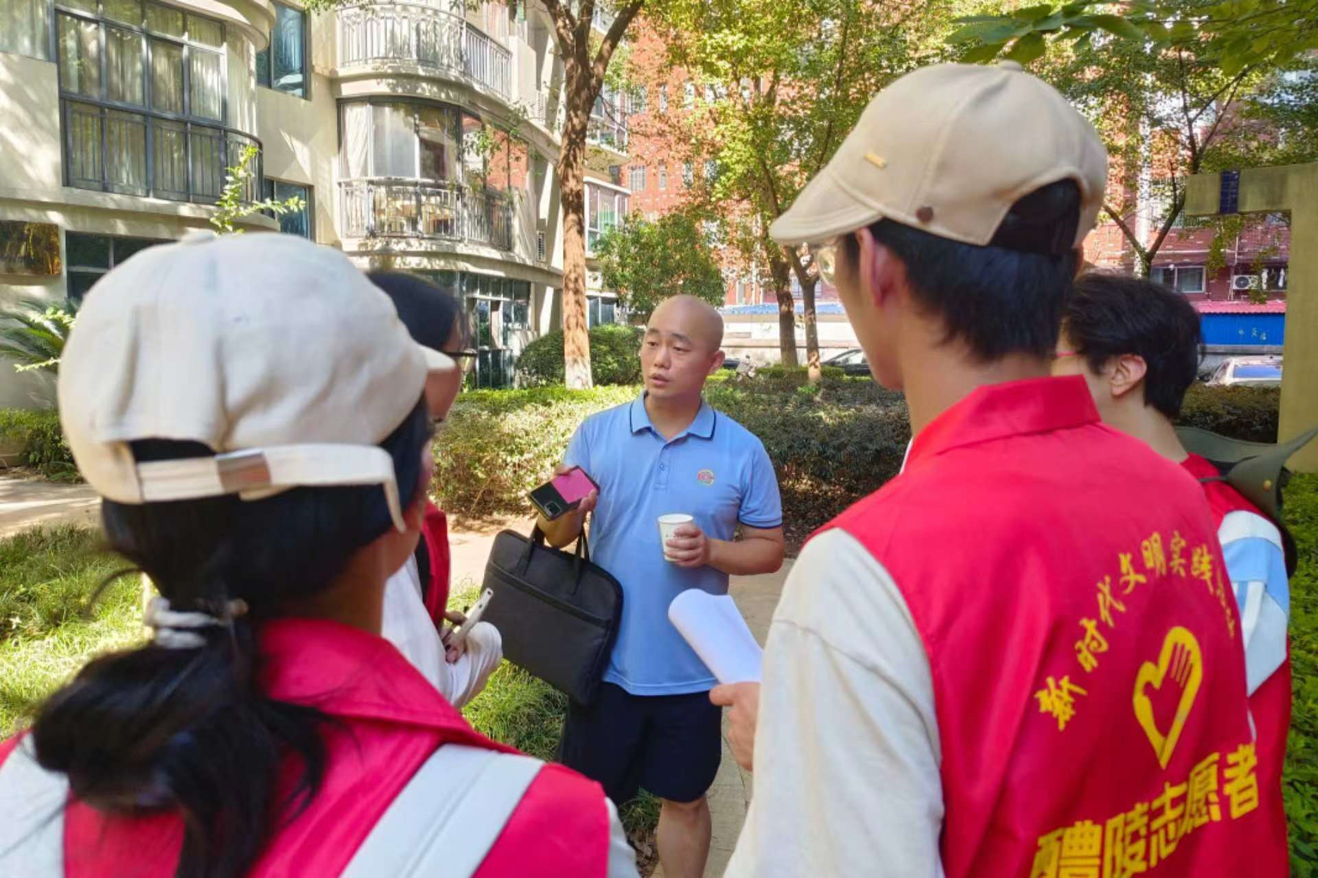 醴陵市五里牌社区星海明筑联络员李权向队员们介绍社区的基本现况