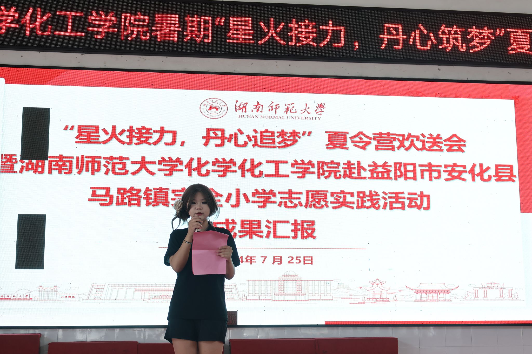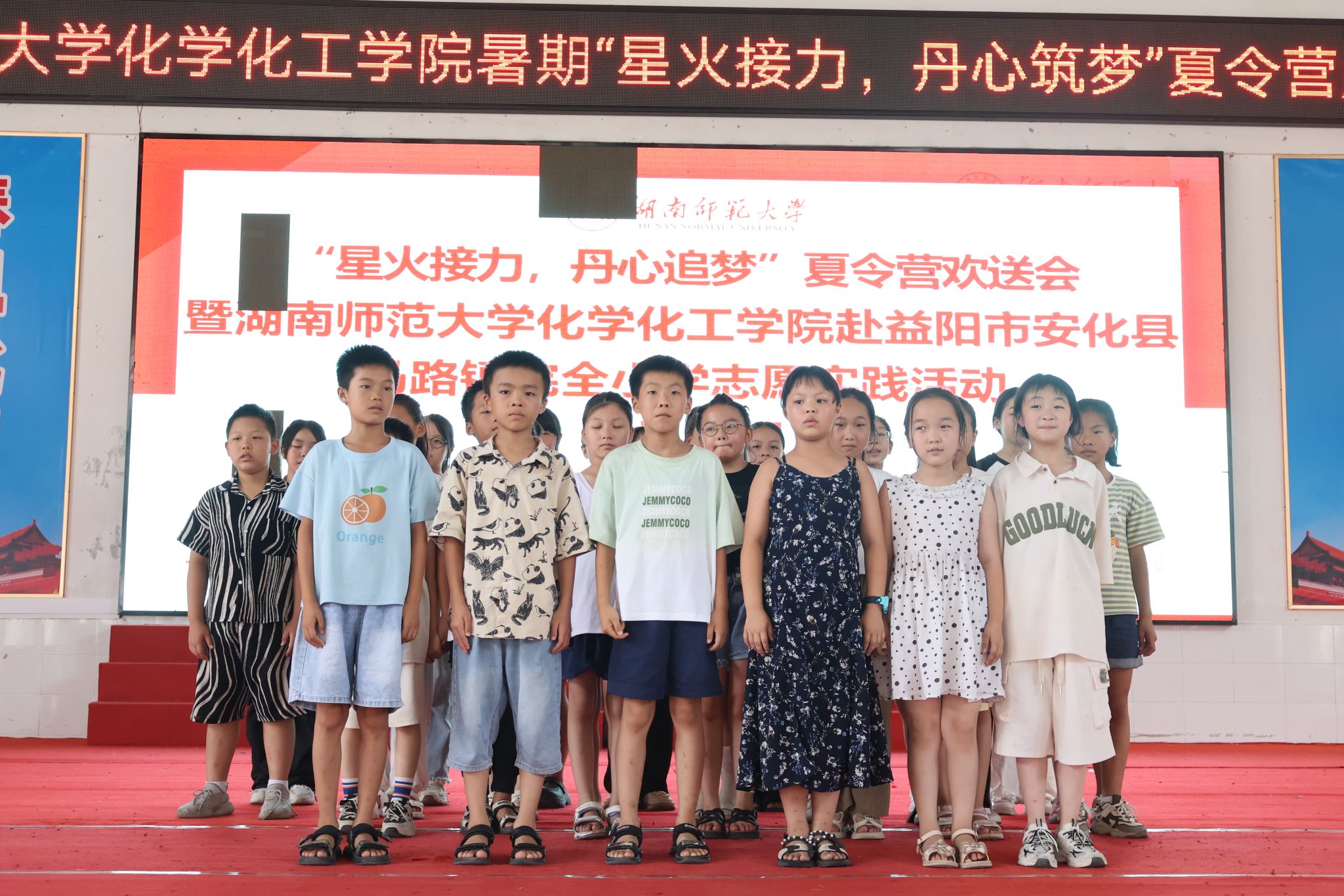 活动于体育馆举办,由实践团队长韩雱朵和调研组组员李艳泽主持。活动主要分为三个部分:队长、各老师及学生代表发言,欢乐展演,奖品发放。其中,欢乐展演环节在开场歌曲合唱《小美满》中拉开序幕,独唱《陪我长大》、舞蹈串烧、乐器表演、黄梅戏《天仙配》、化学话剧等节目轮番上演,来自实践团的成员们带领着夏令营的学生们一起献上精彩的演出。不论是由稚嫩的童音筑就的《小美满》,还是多舞种结合的舞蹈串烧,每一个节目都展现着青少年蓬勃的生命力和创造力。化学话剧将活动带到了高潮,学生们纷纷举手表示想参与此次火焰掌的趣味实验。《陪我长大》一曲将学生和老师的回忆带到了初次见面的时候。时光荏苒,师生合影结束也意味着此次夏令营活动正式落下帷幕。