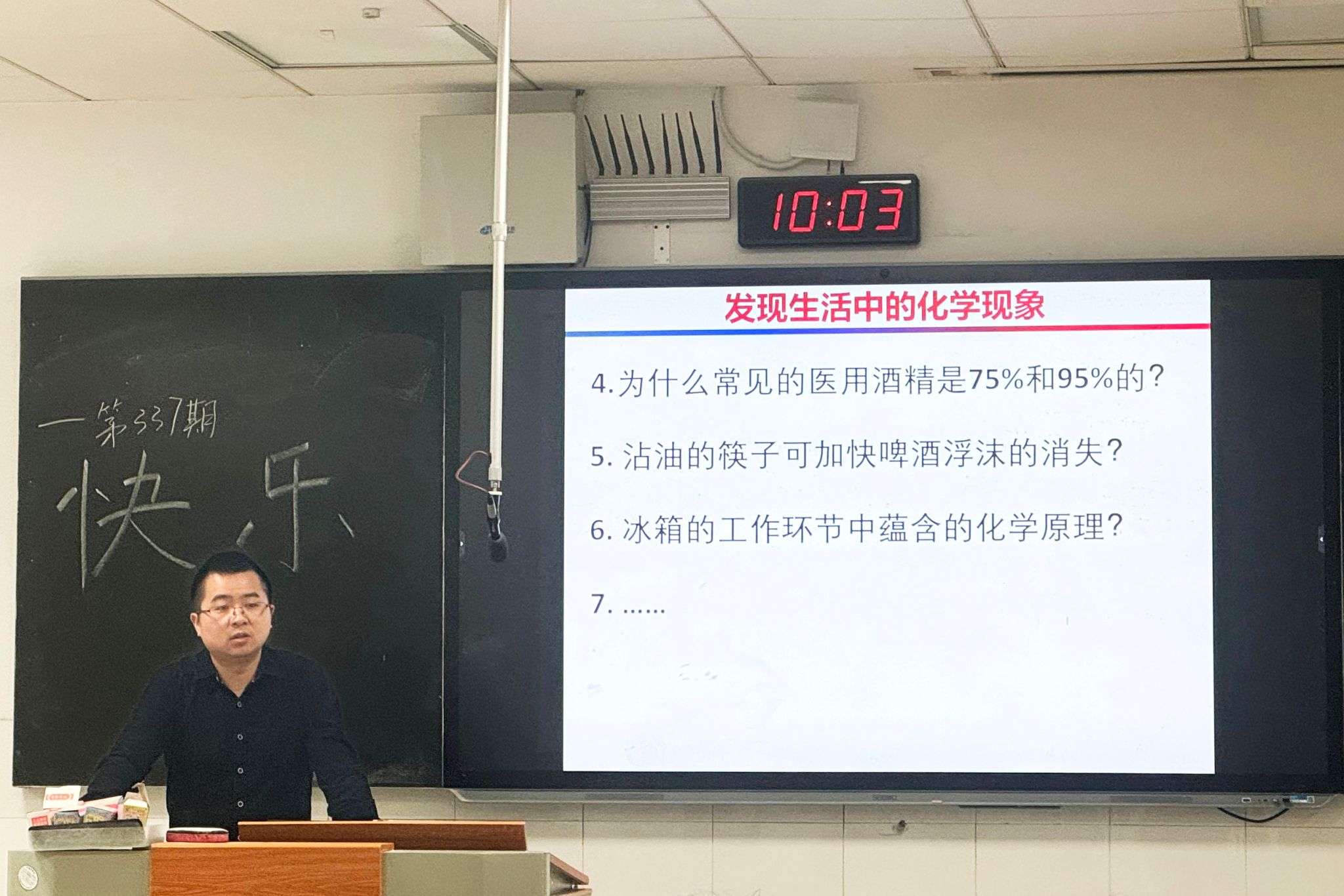 (通讯员 阮文婷)10月26日上午9时30分,伟德国际1949学生会办公室在至善楼117教室开展了第337期快乐周末谈活动。此次快乐周末谈活动的嘉宾为化工院讲师谢超,在本次活动中,谢超向同学们提出要学会发现生活中的化学现象,并仔细思考生活中化学现象产生的原理,期望能帮助同学们将所学的知识应用于生活。