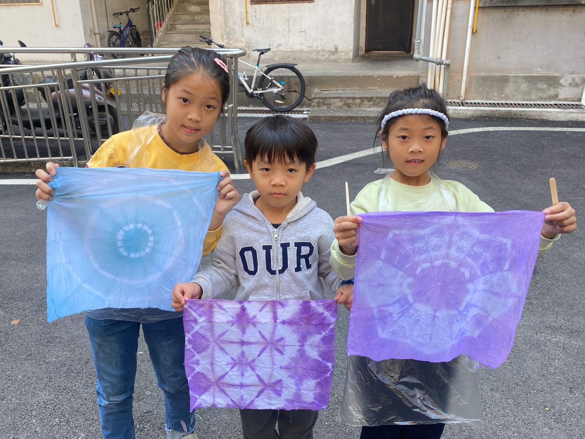 图为小朋友展示扎染作品