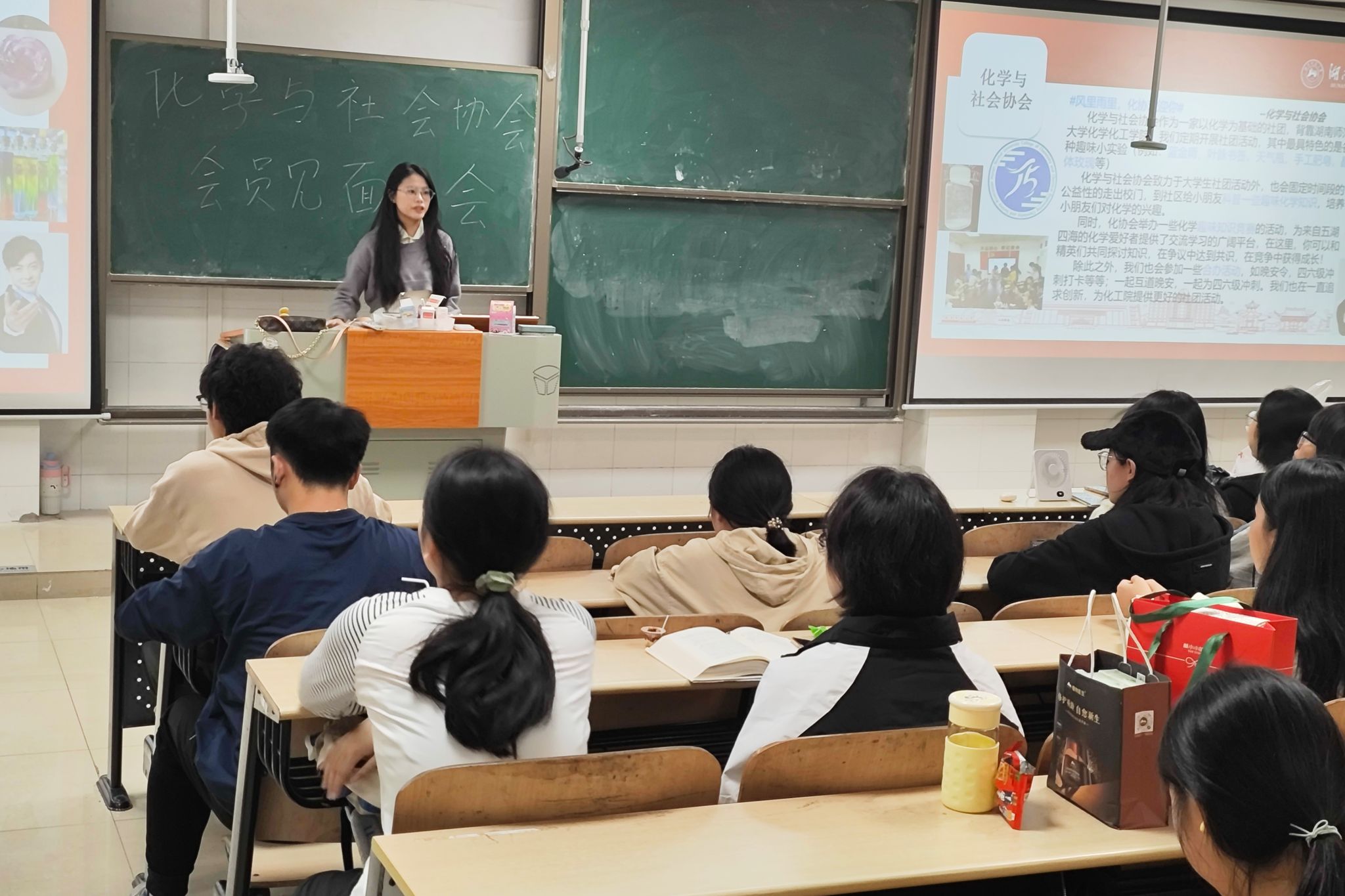 活动伊始,蒋依欣带领理事会成员依次进行自我介绍,并为大家具体介绍化协的特色实验与志愿实践活动。见面会期间,理事会组织会员们进行游戏互动,通过化学猜灯谜、数字炸弹和化学版抢数字游戏增进会员之间的感情,并以小礼品作为游戏奖励,社团会员积极参与其中。游戏环节结束后,会议进行监事会成员竞选环节,通过候选人的竞选发言,此次见面会选举结果为:监事长刘婕,副监事长李非凡,监事彭思锐、杨明、张睿勐。会议尾声,理事会成员为会员们解答会费、活动报名和志愿时长等相关疑问,蒋依欣宣布此次见面会结束,会员们有序离场。