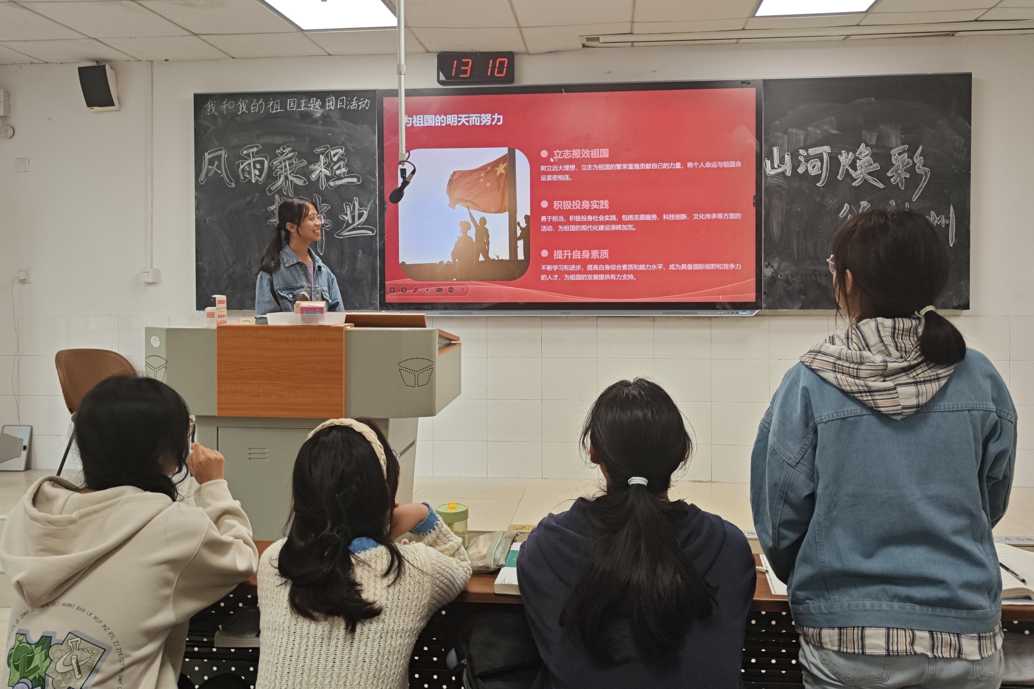 活动伊始,舒玉芝介绍此次活动的主题及活动名称,此次活动分为“祖国,我们的家园”、“祖国在我心中”、“我与祖国共成长”、“祖国的未来在我们手中”四个部分。舒玉芝以丰富的历史文化、繁荣的现代城市为切入点,深入探讨个人、祖国、文化和发展之间深层次的关系,指出青年力量在国家建设中的重要地位,激励同学们肩负起时代的重任,在祖国的大好河山中追逐理想。会议最后,理事会成员分享此次专题学习会议的心得体会,舒玉芝进行整理点评并宣布会议结束。