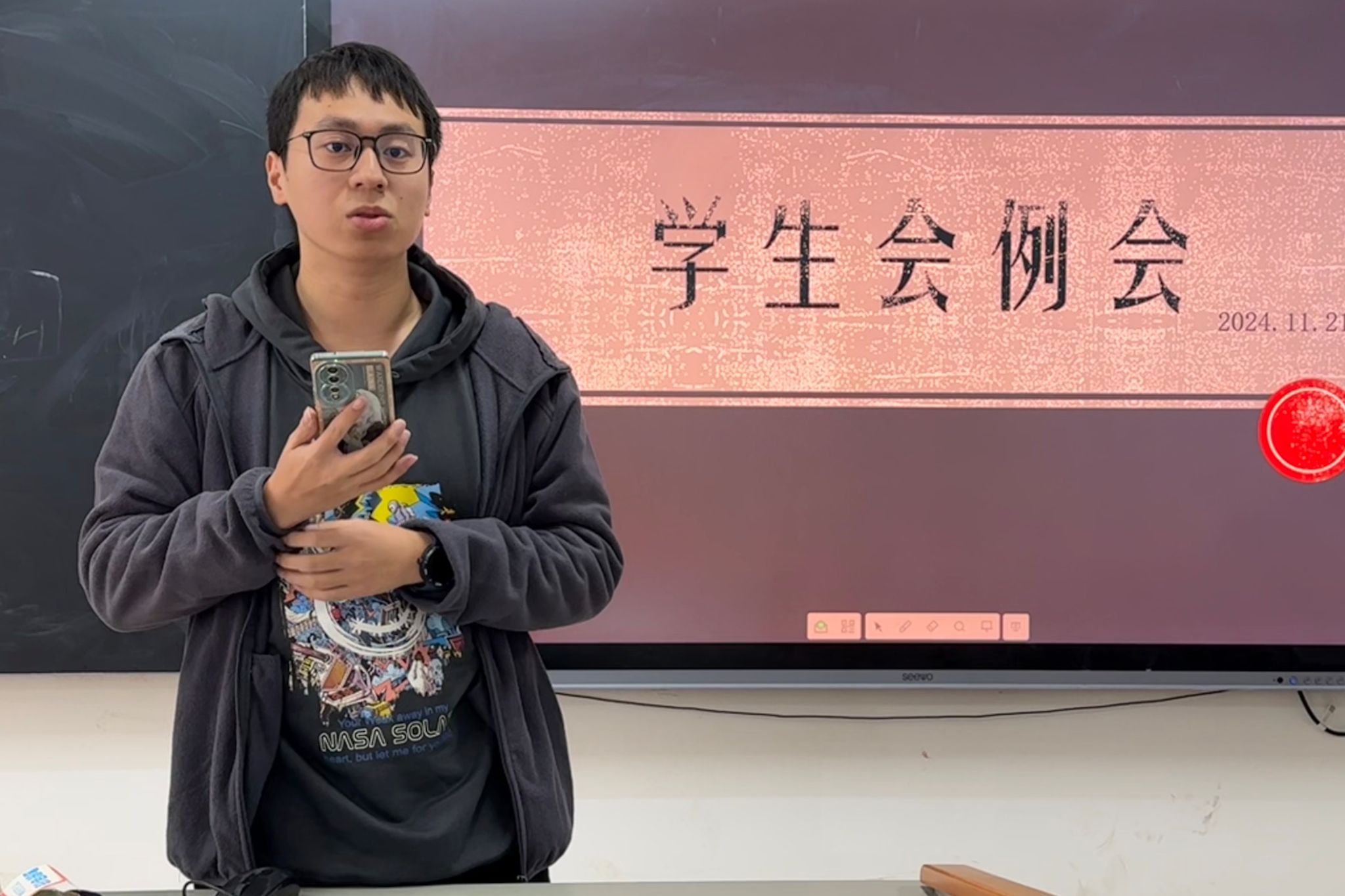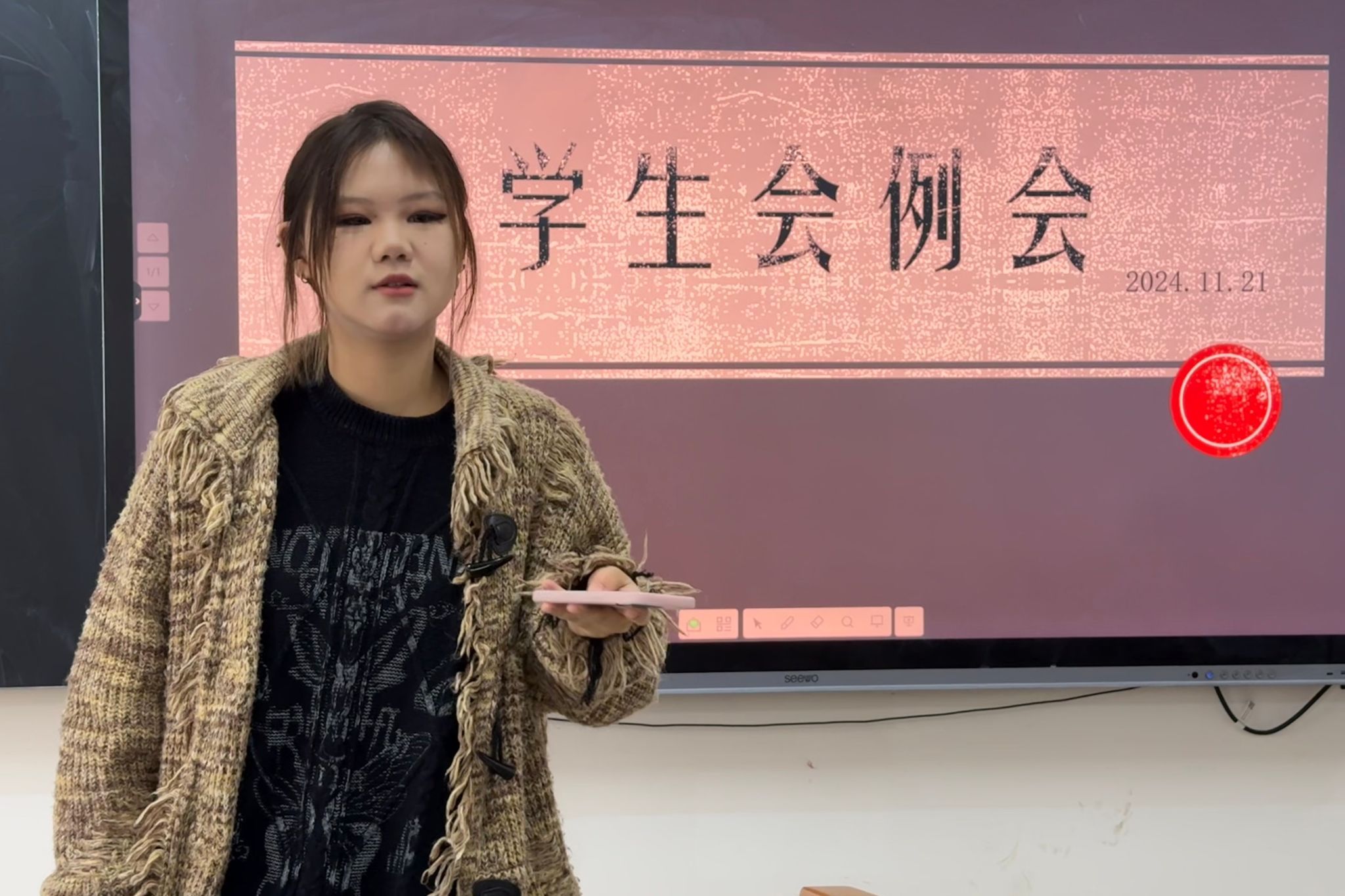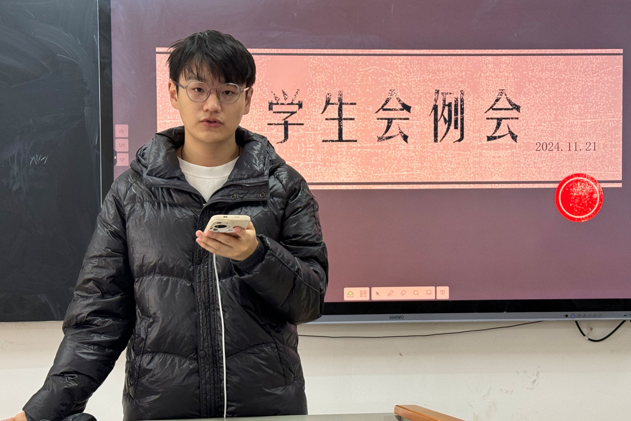 会议伊始,各部门依次汇报近期的工作情况以及未来的工作计划。其中,办公室已完成第340期快乐周末谈,正在进行第341期快乐周末谈的准备工作;宣传部已完成各类微推和说说以及迎新晚会邀请函、入场券、海报的制作;健服部已完成男生节的活动策划以及双十相关微推文案的制作;权益部已公示“资助我来说”活动获奖名单并发放了寒衣补助物资;文体部已完成三大球运动会观众的招募以及迎新晚会海报和暖场视频的制作;学发部已完成职业规划大赛的院赛。主席团成员韩雱朵提醒各部门成员:学生干部应重视自身的政治动向,保持理性思考,不随意站队,不发布不当言论,并再次提醒学生会并不参与查寝事项,以及各部门成员应合理安排时间,注重自身学习。
