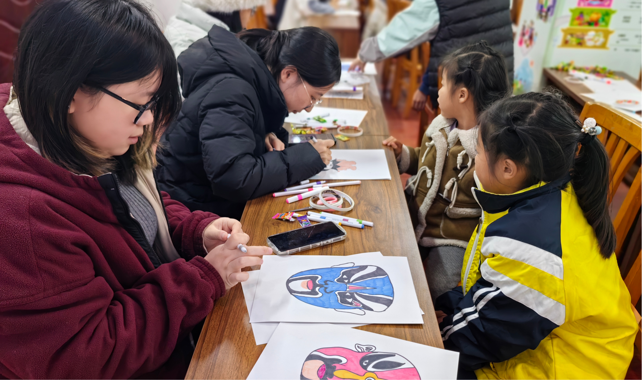 活动过程中,李思仪向会员与小朋友介绍了我国的脸谱文化,并展示了一些经典的京剧脸谱样式。会员与小朋友们根据会员群中提前发布的脸谱样式,用黑笔勾勒出线条,再以鲜艳的色彩填充,绘制出生动的脸谱。部分会员与小朋友还发挥自己的想象力,为人物画上扇子、刀、剑等配饰,绘制出具有独特风格的脸谱。小朋友们积极向参与人员介绍自己制作的脸谱所代表的人物及其性格。活动的最后,志愿者带着小朋友们在社区门口拍照留影。