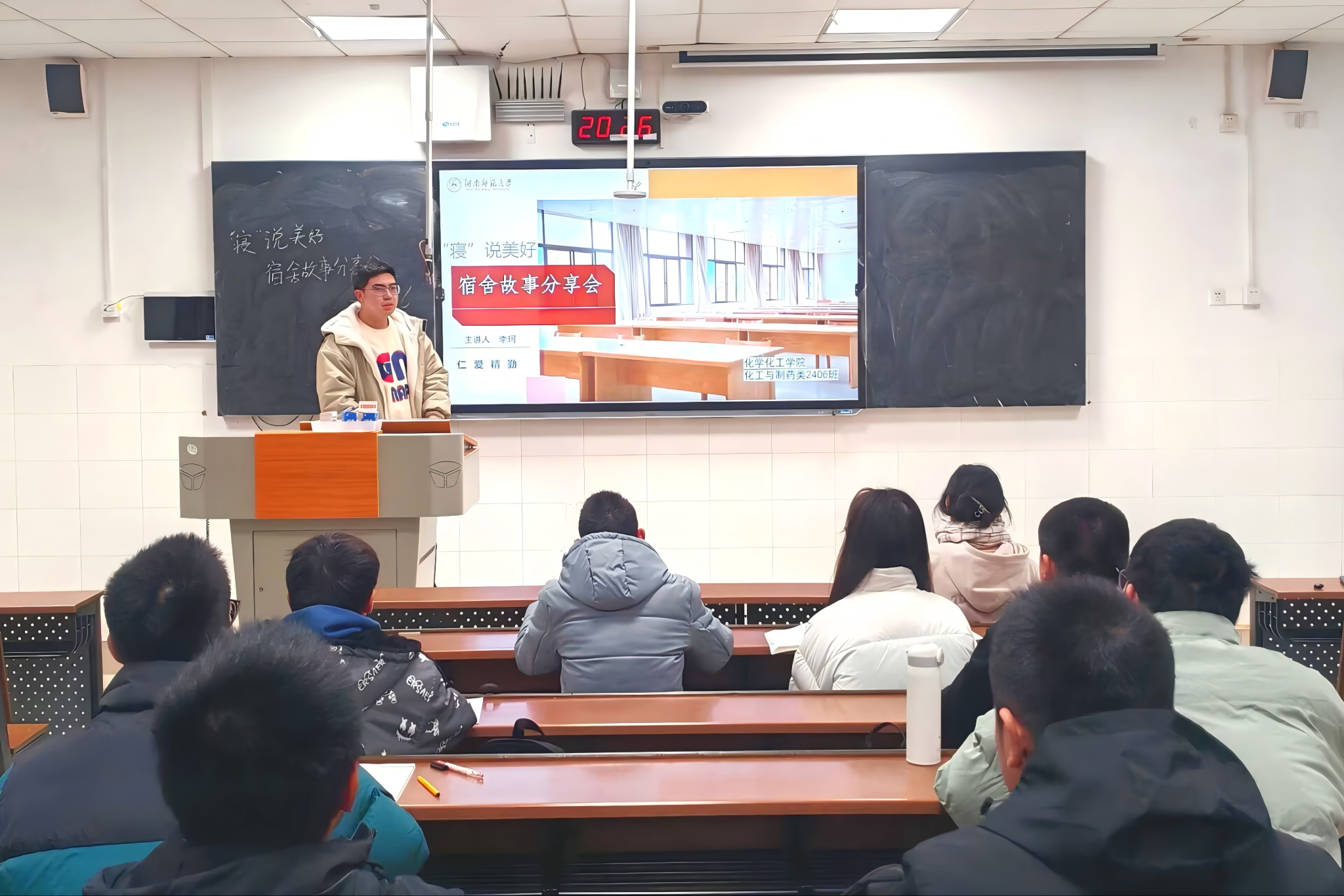 李珂以“快乐与寝室”为引,向同学们介绍此次活动的内容与主题,并展示了国庆期间寝室风采的合拍。肖梓逸介绍了寝室内的成员组成,同时向同学们分享了寝室内部的制度建设,得到了大家的一致认可。宁智康则讲述了寝室生活的趣事,并说明了寝室内成员和睦相处的重要性。在总结环节,李珂从“打卡”、“查寝”、“安全”三方面提醒同学们需要注意的事项,鼓励大家积极建设寝室的规章制度,与室友们和睦相处,从而营造一个良好的寝室氛围。