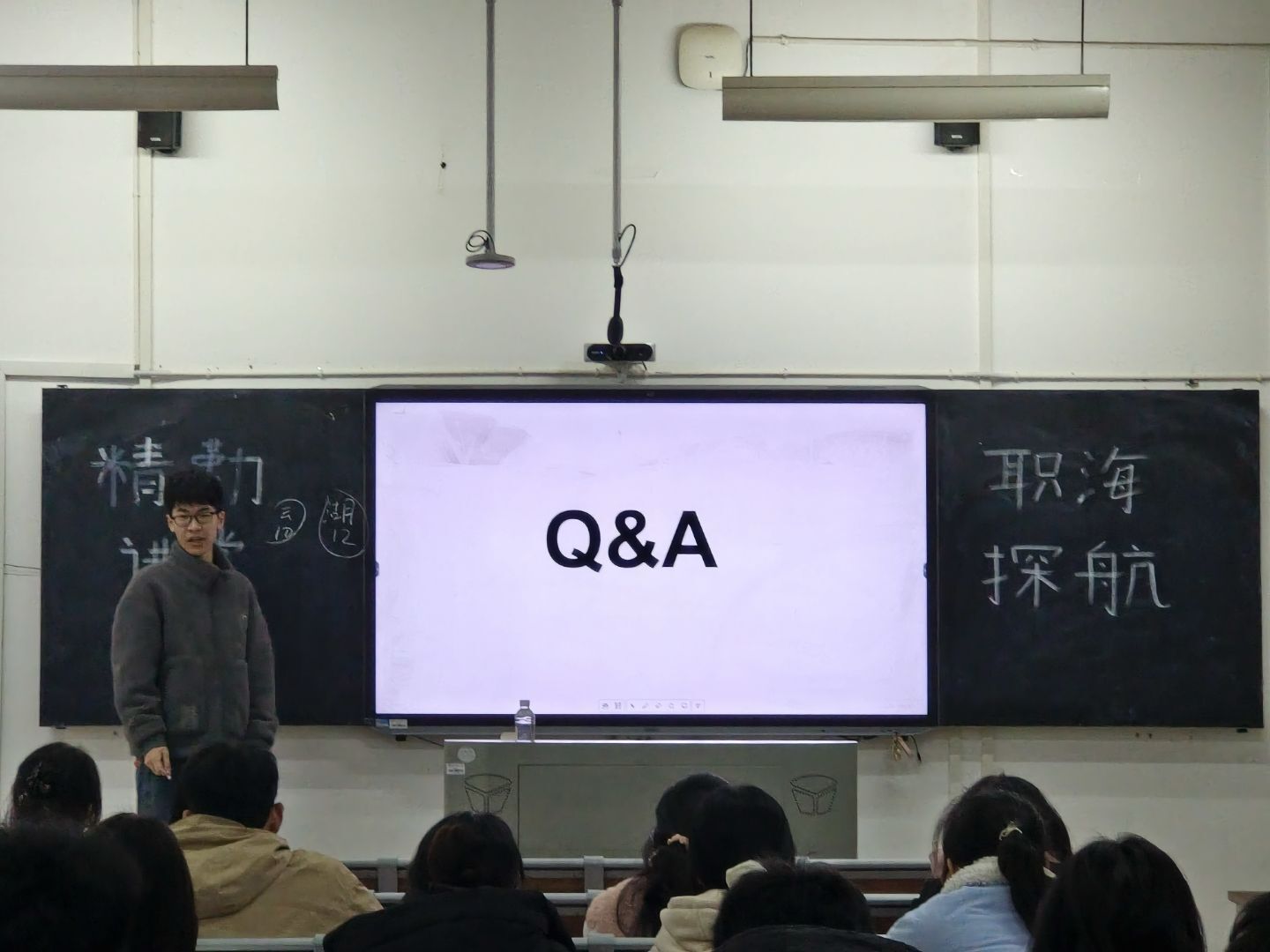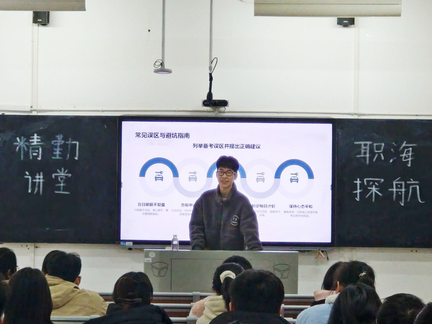 (通讯员 毛尚峰 熊志惠)3月6日中午,化工院团委青年创新创业部在化工院117教室举办精勤讲堂之职海探航。此次精勤讲堂由2021级本科生朱伟涛担任主讲人,青年创新创业部干事陈柳蓉担任主持人,2022级、2023级及2024级部分学生参加此次活动。