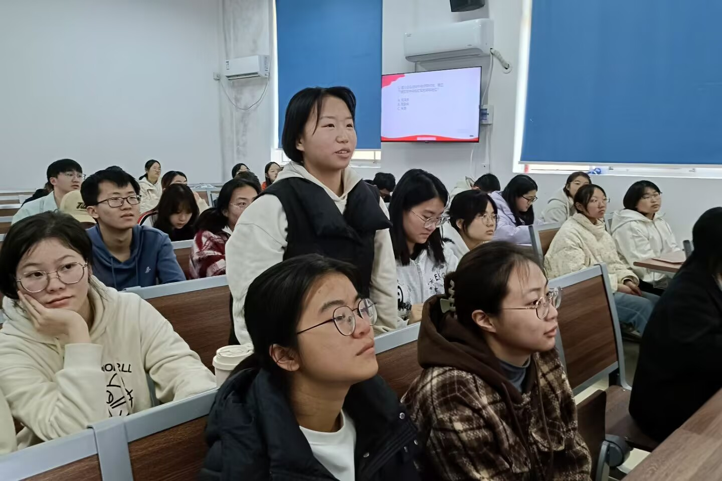 周佳从遵义会议的时代背景、基本过程及其历史意义三个方面出发,向学员们深入剖析遵义会议精神的主要内涵与重要启示。她结合历史故事,带领学员们重温遵义会议精神的产生和其深远影响,并号召全体学员要怀着昂扬的斗志、无畏的勇气,向着中华民族伟大复兴的目标奋勇迈进。课程临近尾声,有关沂蒙精神和遵义会议精神的知识竞答环节紧密围绕宣讲内容展开,学员们举手回答问题,题目不仅检验了大家对红色精神的理解,也激发了大家的学习兴趣,促使其在思考和回答中深化对沂蒙精神和遵义会议精神的认识。