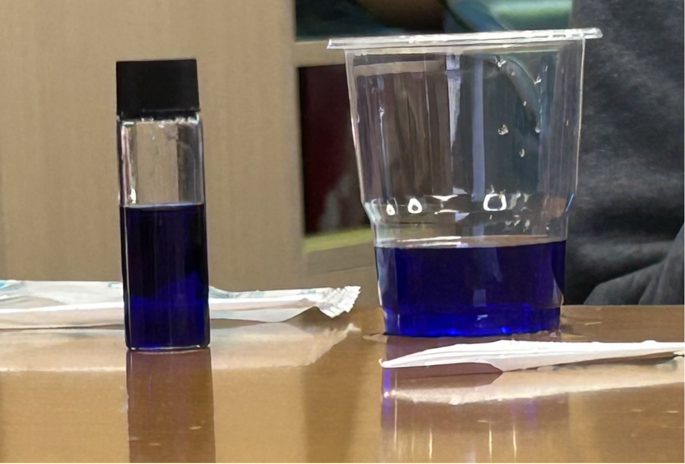 活动开始前,化协负责人蒋依欣带领社团理事提前准备实验材料和相关器材,在QQ群及空间说说发送活动预告,确保会员知晓此次活动内容。活动期间,会员们自行分组领取相关实验材料,在化协负责人刘心雅兰讲解完实验步骤和原理之后,会员们亲自动手操作,体验紫色沙尘暴实验的趣味。实验过程中,会员们先将硫酸铜固体用水溶解,再向其中加入N-乙二胺,溶液因硫酸铜和N-乙二胺的配位作用生成硫酸二乙二胺合铜而呈现特征紫色。