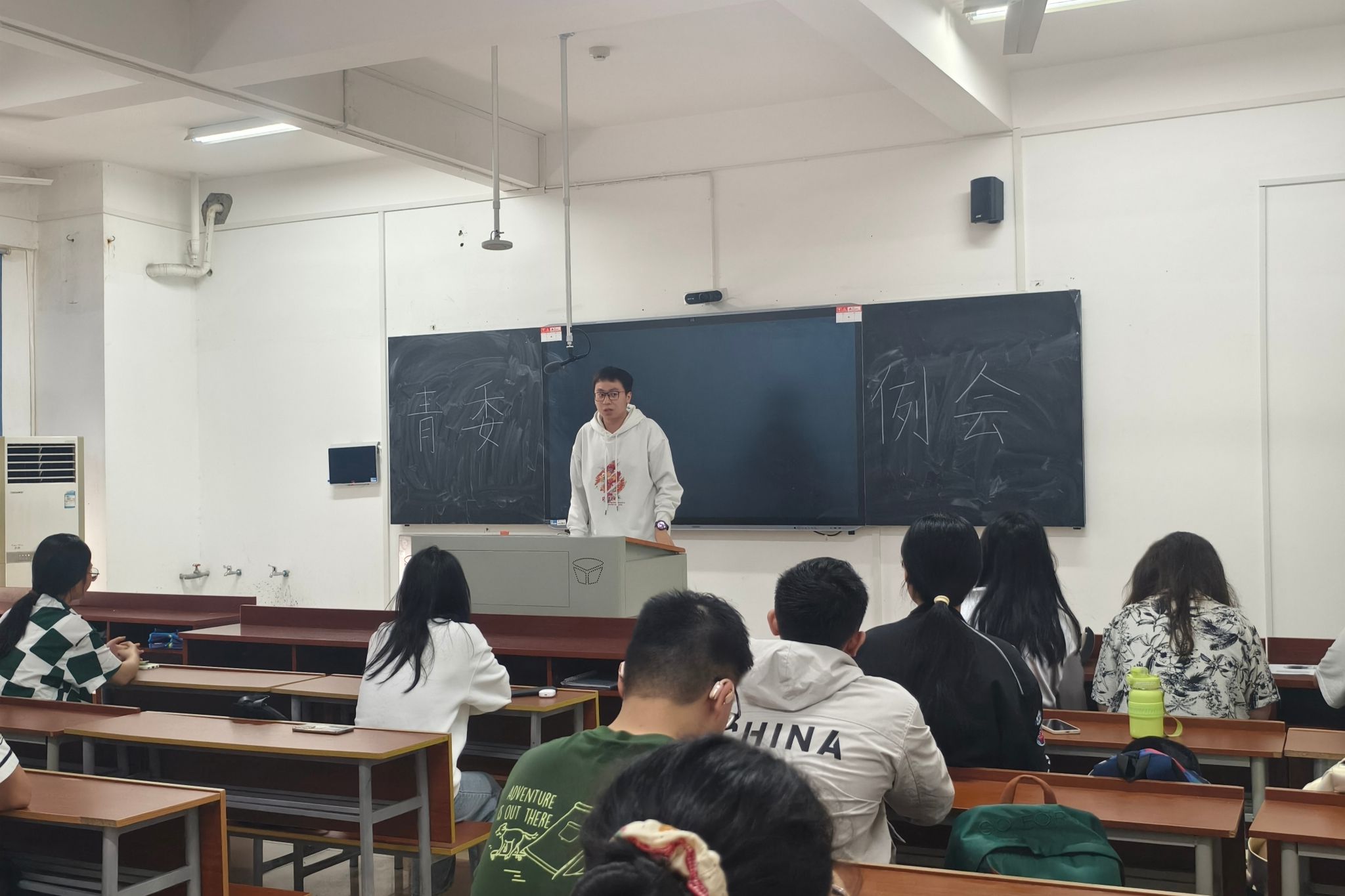 于晓涵对大家的到来表示欢迎,会议正式开始。依照会议流程,23级、24级青委对上月工作情况和下月工作计划进行简短汇报。青工部第一负责人谢北就近期青委工作提出两点注意事项:1. 注意填报志愿活动时的秩序 ,不能随意改动他人信息,不要在表中填写无关内容。2. 青委举办活动的积极性不足,需要进一步提升活动组织的频次。此外,谢北还阐述了志愿时长的认定标准。
