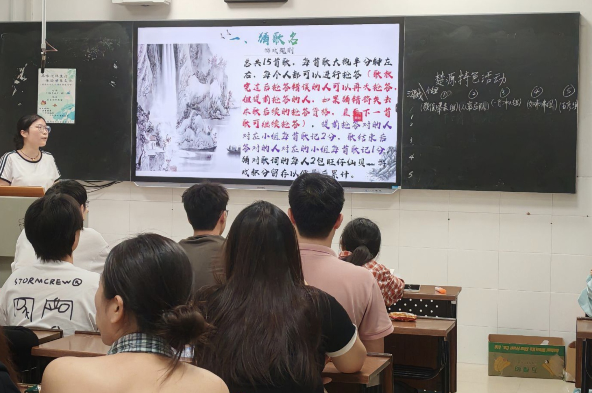 活动环节丰富多样,主要分为趣味游戏和心得分享两部分。在游戏环节,同学们热情高涨,踊跃参与主持人设计的各类小游戏,如:猜歌名、加字游戏、你画我猜、数字炸弹、国内外知识竞答。大家在收获丰富零食奖励的同时,也为各自小组赢得积分。游戏结束后,主持人统计积分,宣布获胜小组,随后,活动积分排名前三的小组代表上台,分享了学习生活文化课程的感悟与体会。活动最后,全体参与人员合影留念,用镜头定格美好瞬间。