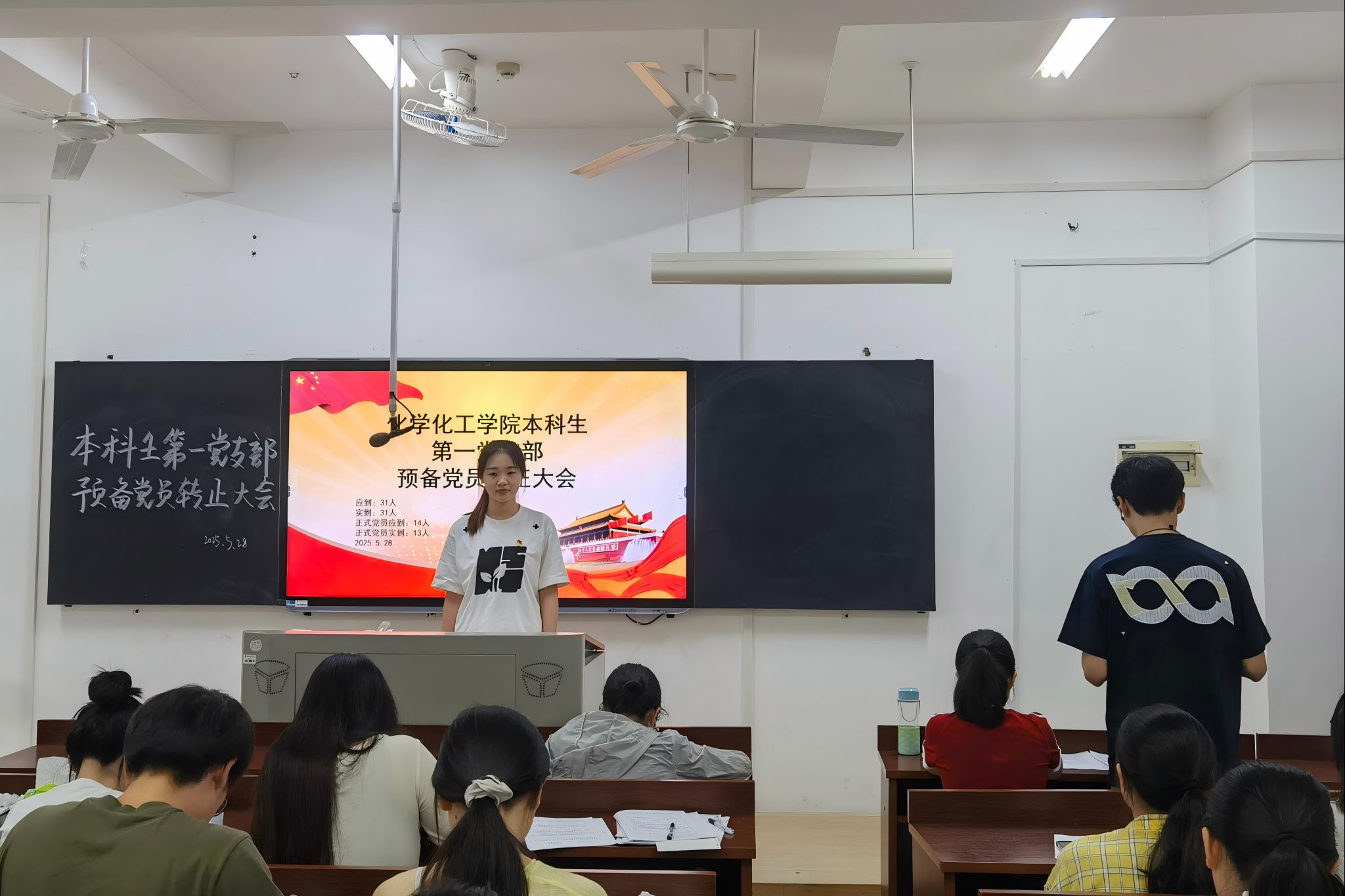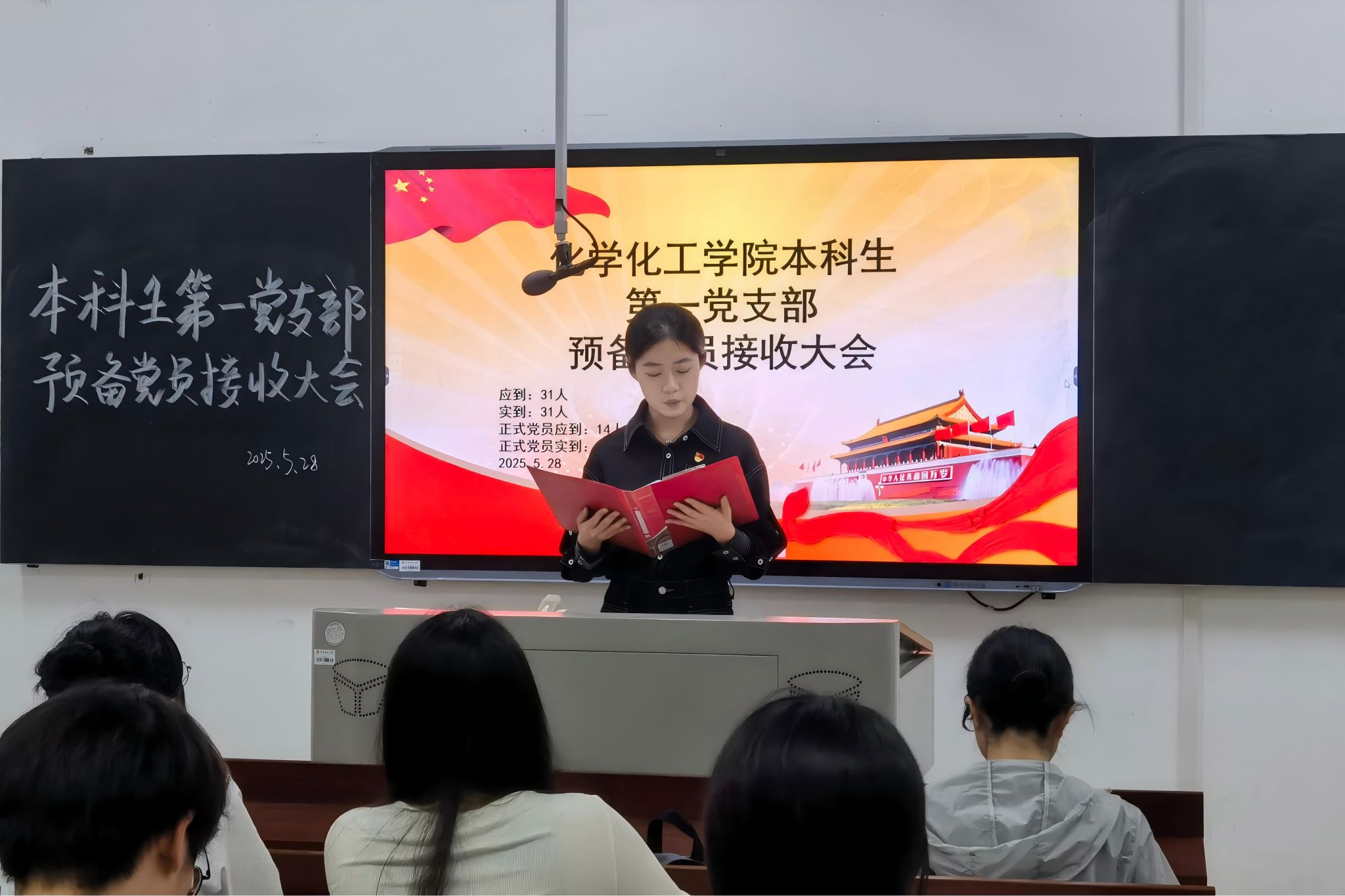 (通讯员 柴琳)5月28日中午,化工院本科生第一党支部于化工楼217教室召开预备党员接收转正大会,讨论关于刘婕等9位同志接收为预备党员及朱羿晓等12位同志转为中共正式党员的问题。此次大会由柴琳主持,支部全体党员及发展对象准时参加。