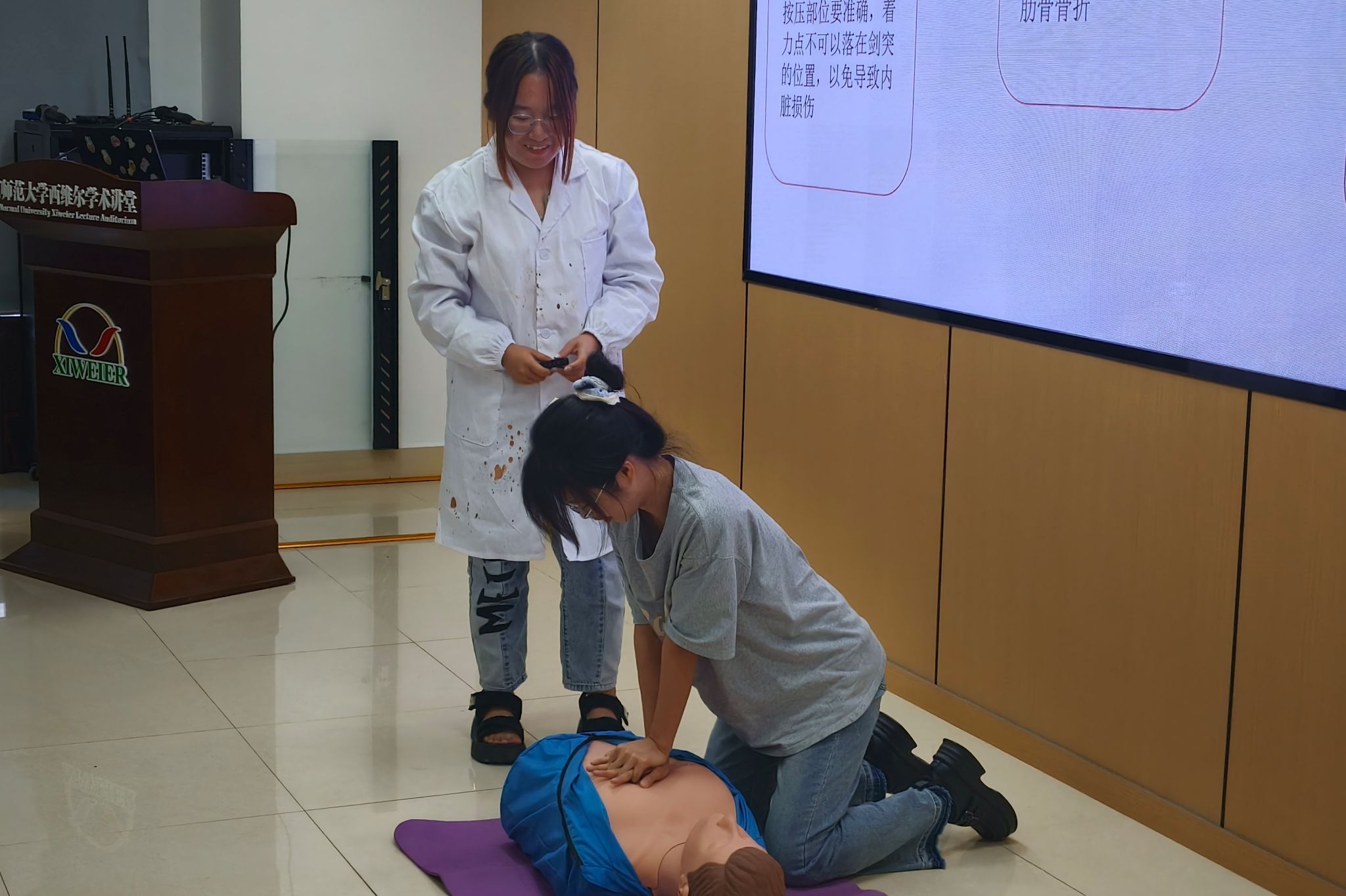 活动伊始,2024年“三下乡”优秀实践团队代表代表蔡紫婧、韩雱朵、刘雅凯三人结合自身经历,分别从项目申报、宣传调研、教学任务等方面向同学们传授了经验。前社会实践部负责人潘楚楚对“三下乡”活动细则以及奖项进行介绍与解读,鼓励同学们坚持“做有所成”,尽力取得更为丰富的实践成果。医学院讲师团为同学们带来一堂实用而重要的“生命必修课”,此次课堂不仅讲解了心肺脑复苏等急救知识,更进行了生动的现场操作演示。互动环节,学生代表在讲师指导下亲手体验了CPR操作流程,让安全技能从理论走向实践。活动尾声,唐健清做总结发言,他提出各队伍要扎实开展特色主题活动,鼓励同学们以积极乐观的态度投入此次“三下乡”活动,同时提醒各位同学务必提高安全意识和自我保护意识,在实践中锻炼自我,提升能力。