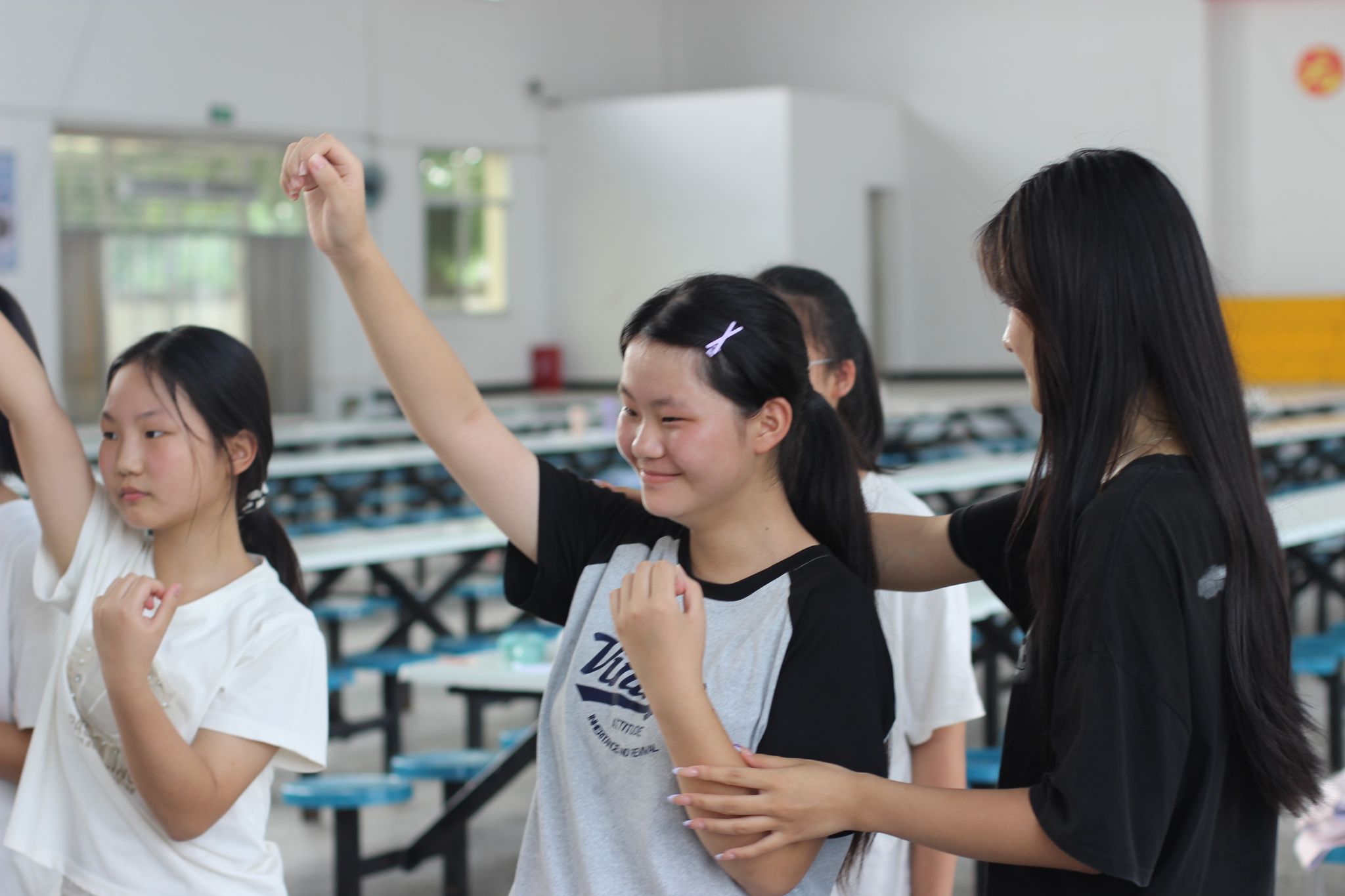 舞蹈课上,老师耐心辅助学生调整动作,帮助学生找到手臂正确摆放位置