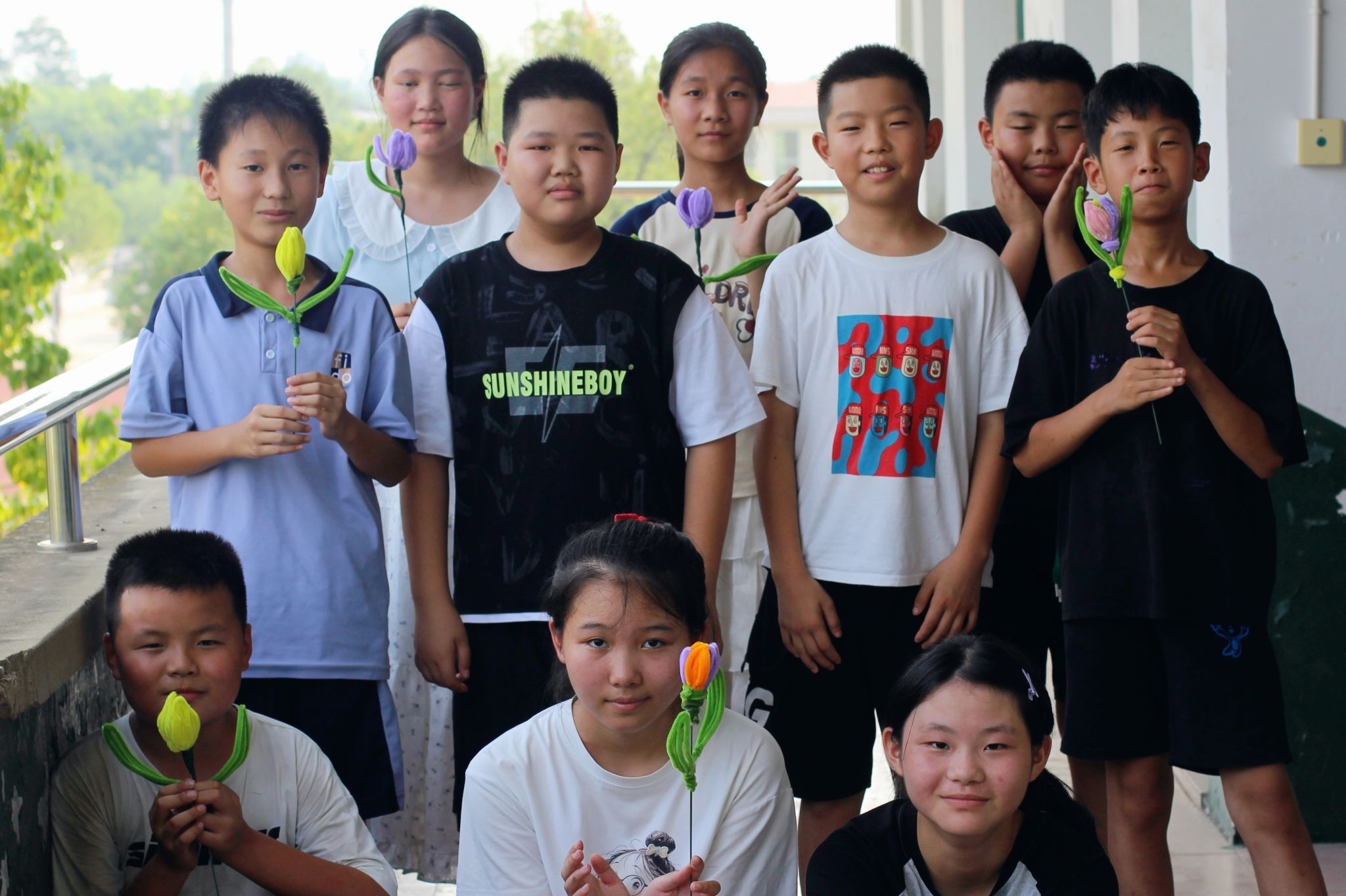 学生们手持自制郁金香,展示手工课成果,用创意装点暑期实践