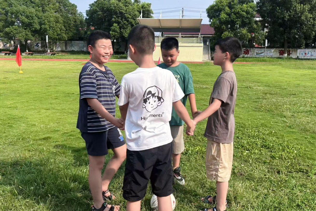 趣味足球绕杆接力现场,少年们手拉手,活力四溢
