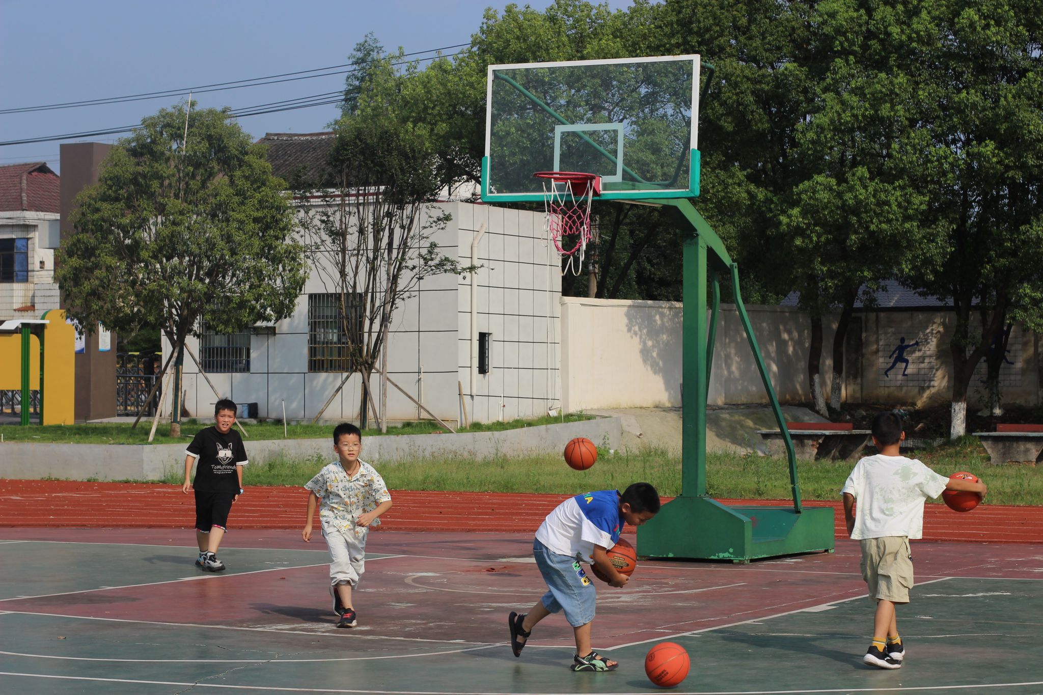 趣味体育课堂上,孩子们在篮筐前依次三步上篮,锻炼体魄