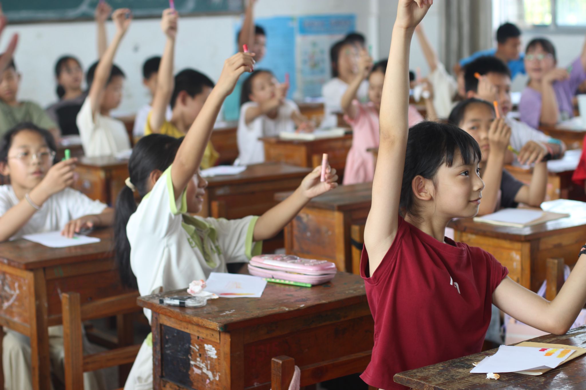 美术课堂上,学生们右手高举蜡笔,踊跃参与互动,创作热情高涨