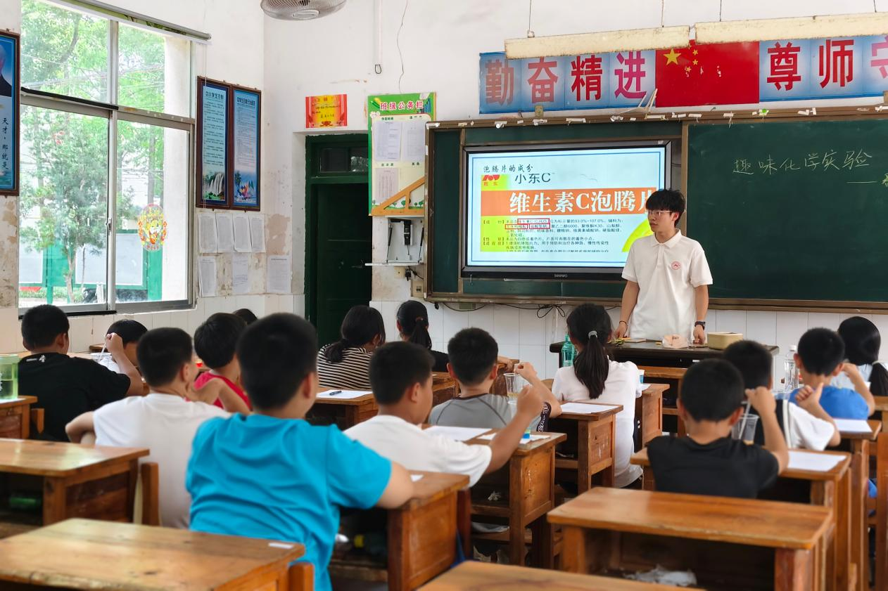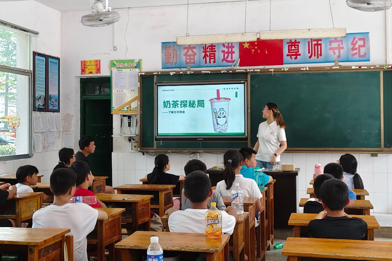 此次课程兼顾知识传授与实践探索,分为生活中的化学课与趣味化学实验两部分内容。生活中的化学课以学生熟悉的奶茶为切入点,从原料采购、配方分析到成分检验,层层解读背后化学原理。实践团成员生动讲解化学基础概念,引导学生认识化学用语,并且设置互动问答环节,激发学生积极性。在实践团成员的带领下,学生们逐步掌握了简单元素符号、离子符号,以及化学式与物质分类等基础知识,真切地感受到了化学与日常生活的紧密联系。