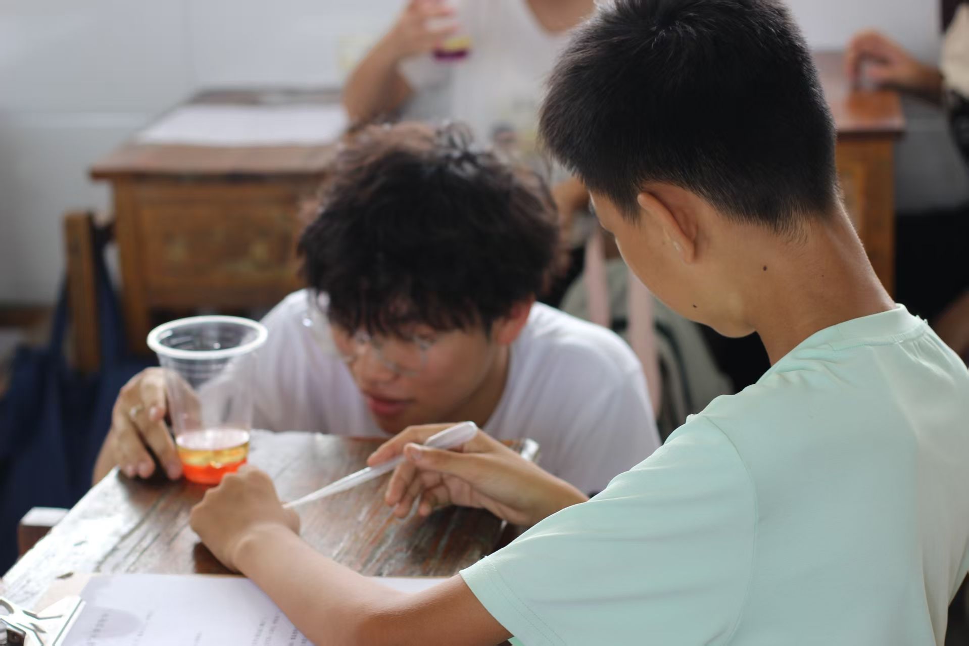 在实验操作环节,学生们在方子毅的指导下,利用清水、食盐、食用油、食用色素和泡腾片等安全易得的材料,亲自动手操作。在调配好有色“岩浆”溶液后,学生沿杯壁缓缓注入食用油,直观观察到因密度差异形成的油水分层现象。投入泡腾片后,释放的气体推动彩色溶液向上翻涌,模拟出“熔岩喷发”的奇妙景象。方子毅同步讲解实验背后的科学原理,将趣味现象转化为知识要点。