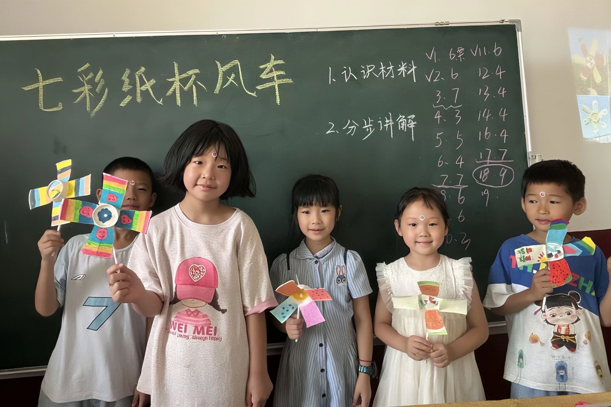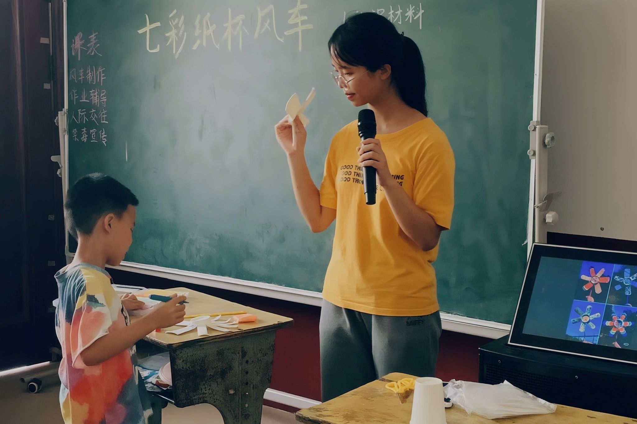 课程准备阶段,主讲人结合学生情况,分别开设了风车制作与手抄报绘制课程。在面向低年级的纸杯风车制作课中,主讲人展示了利用纸杯制作风车的方法,引起了学生们的浓厚兴趣。主讲人分步讲解制作流程,帮助学生们进行剪裁、折叠和组装操作。作品完成后,主讲人鼓励学生上台展示自己制作的风车,课堂氛围活跃。