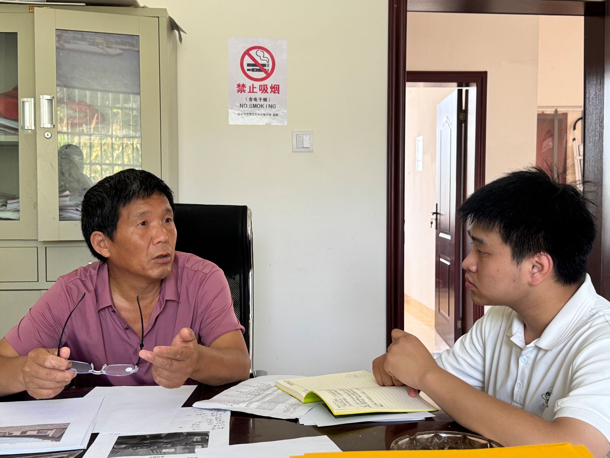 实践团调研组成员与政府工作人员杨秀云、陈烨在三观寺村会面。调研组成员围绕三观寺村的网格化治理内容,环境保护工作内容和重点工作推进等方面对杨秀云和陈烨进行采访。杨秀云向调研组成员介绍三观寺村环境保护措施,如设立卫生协会,组织村民学习环境保护知识。陈烨向调研组成员介绍三观寺村的网格化治理内容和作用。关于三观寺村基层治理内容,陈烨还向调研组成员表明,村政府会定期收集民意资料,对村民相关信息进行采集,确保基层治理工作的进行。