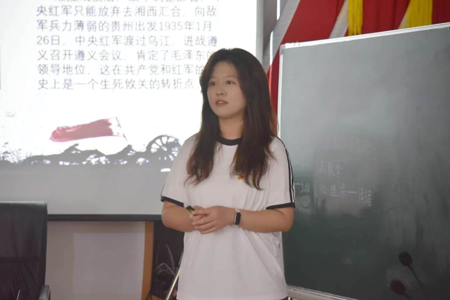 在长征精神学习中,主讲人组织学生集体朗诵《七律·长征》,回顾长征重要战役,学习相关英烈事迹,并阐释长征精神内涵。通过视频导入、小组讨论、问答互动等方式,引导学生感悟长征精神,学习英烈事迹。