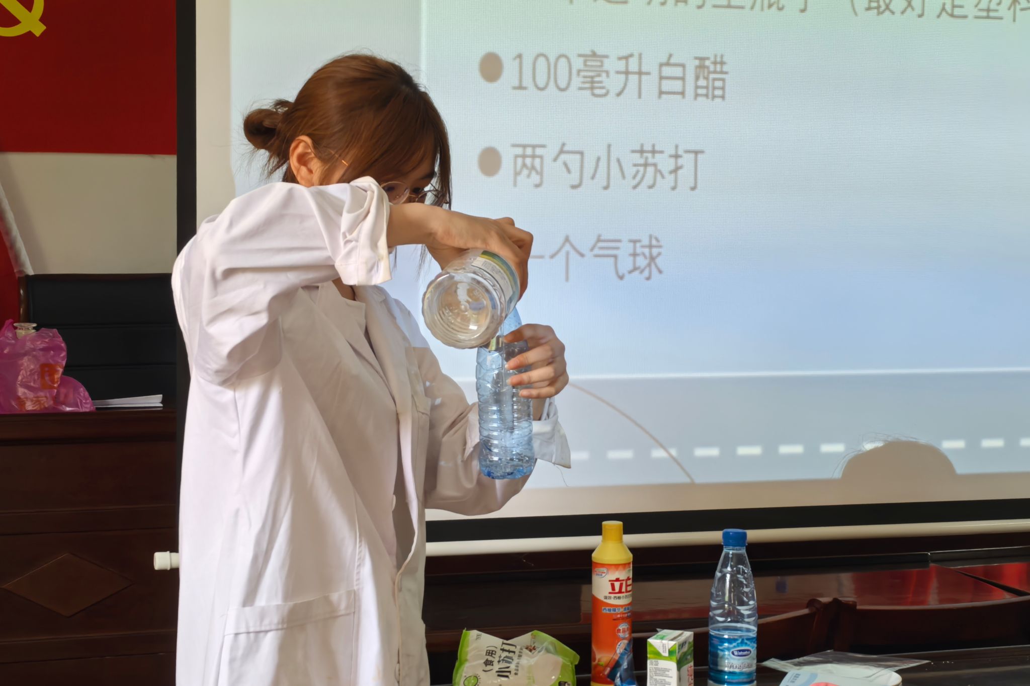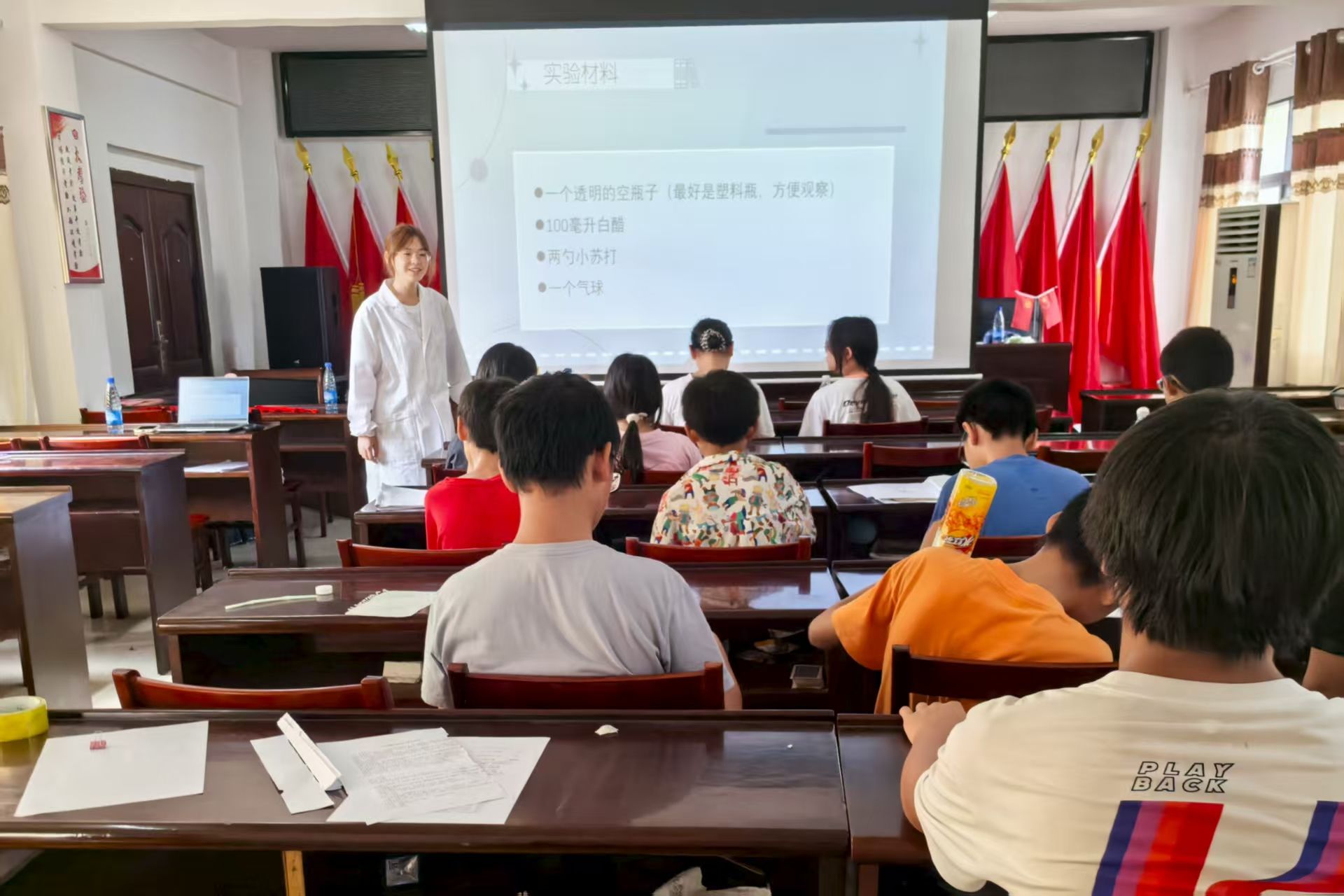 (通讯员 袁纯婉 段叶蕤)7月17日下午,邵韵传知”暑期实践队赴邵阳市新宁县水庙镇开展了一堂趣味化学实验课。实践队以常见生活物品为器材,带领20余名学生完成“空瓶吹气球”和“烟花绽放”实验,将基础化学知识与实践操作融合。