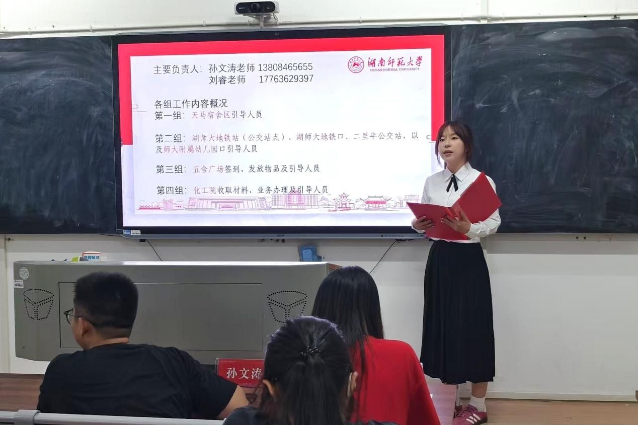 青工部第二负责人赵欣介绍了志愿者的分工与职责,于晓涵讲解了可能出现的情况及应对措施。朱伟鹏做总结发言,他表示志愿者们要在工作期间保持细心、耐心、热心的服务态度,规范言行举止,认真完成工作,充分展现出化院学子的良好精神风貌和服务水平。