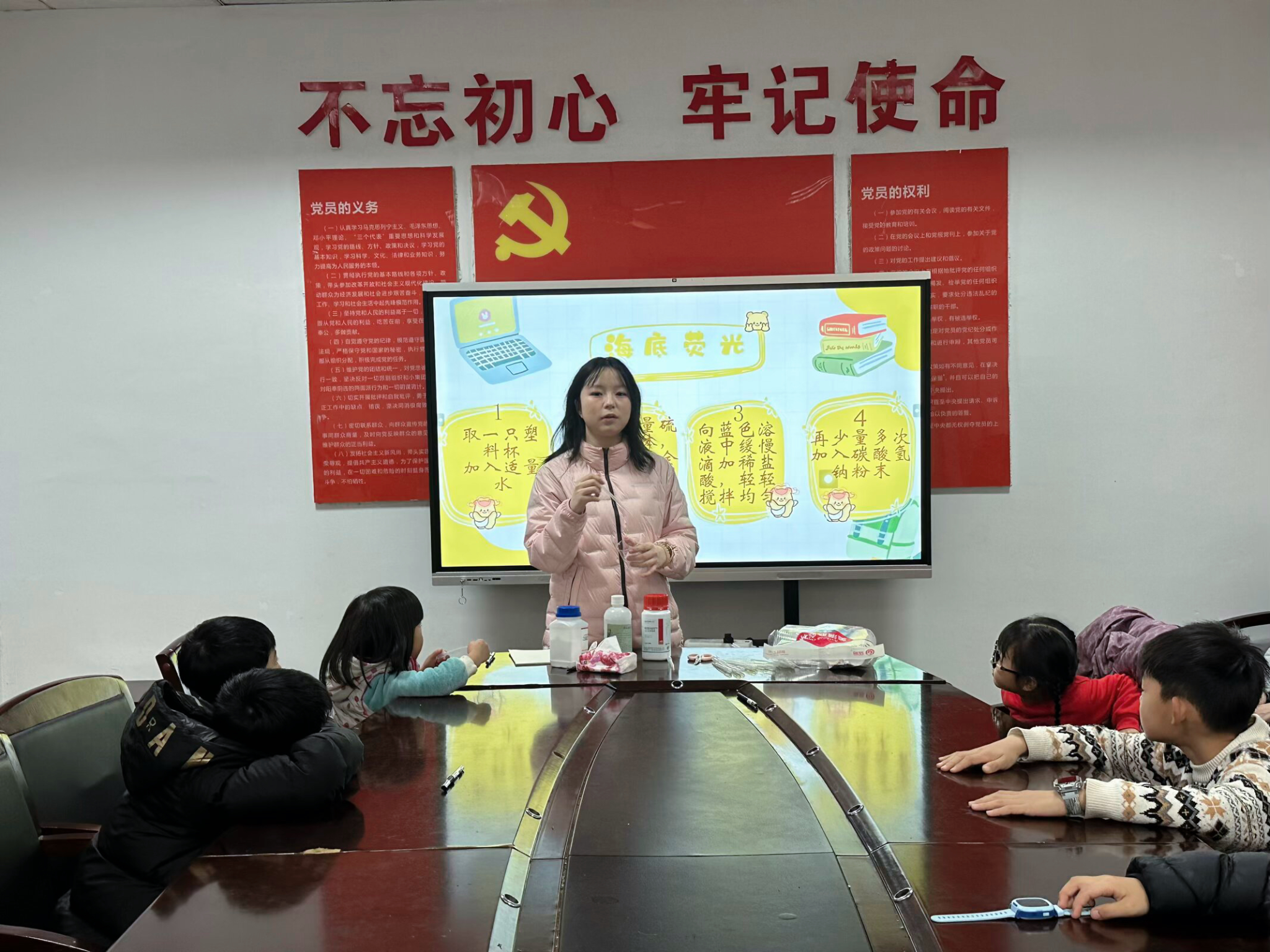 活动开始,负责人周丽君以“海底世界”与“璀璨星空”为主题引入,为参与儿童讲解了相关化学基础知识,并强调了实验安全规范。在实践环节,志愿者与孩子们结成一对一指导小组,共同完成了“海底荧光”与“流星雨”两项趣味化学实验。通过观察酸碱反应生成的絮状沉淀及维生素B2溶液产生的黄绿色荧光现象,孩子们直观理解了沉淀生成与物质荧光特性等化学原理。活动现场,孩子们动手实践,积极探索化学奥秘,志愿者们在旁耐心引导,及时解答疑问,整体氛围和谐融洽。