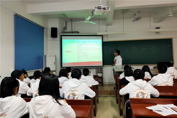 会议初始,宋涂暄对1906班的班级符号进行了介绍,并回忆班徽的5个设计初稿和班级生日的确定过程,同时也向同学们展示了班服和班旗的设计,公布了班风和班训。文艺委员彭卓带领大家学习了自创的班歌《青春万岁》。在班委们对入学以来的状况进行总结后,全班同学为团支部建设提出了自己的建议。