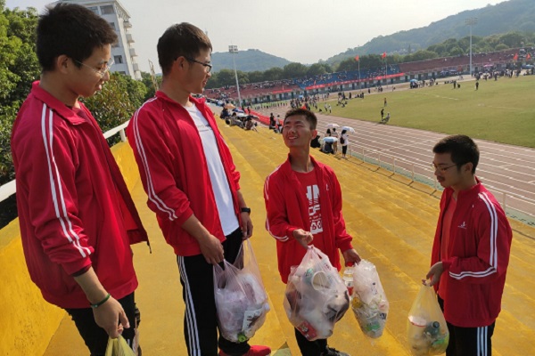活动开始前,志愿者们在田径场楼梯口集合,负责人安排好相关事宜后带领志愿者们开始活动;志愿者们进入观众区,收集化工院观众区的塑料瓶等废品,而后以小组的形式进行活动,收集了周围空地上遗留的垃圾。志愿者们将垃圾统一放到一个大垃圾袋中,进行统一处理。